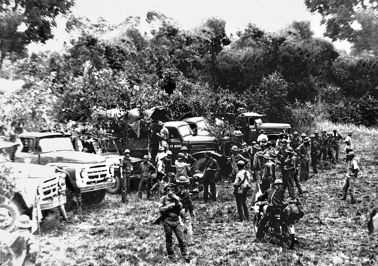 | Giữa đồn điền cao su Ông Quế, Ban chỉ huy Trung đoàn Khe Sanh trải tấm bản đồ do nhà báo TTXVN Đinh Quang Thành tặng để nghiên cứu kỹ càng từng tuyến đường vào Sài Gòn |