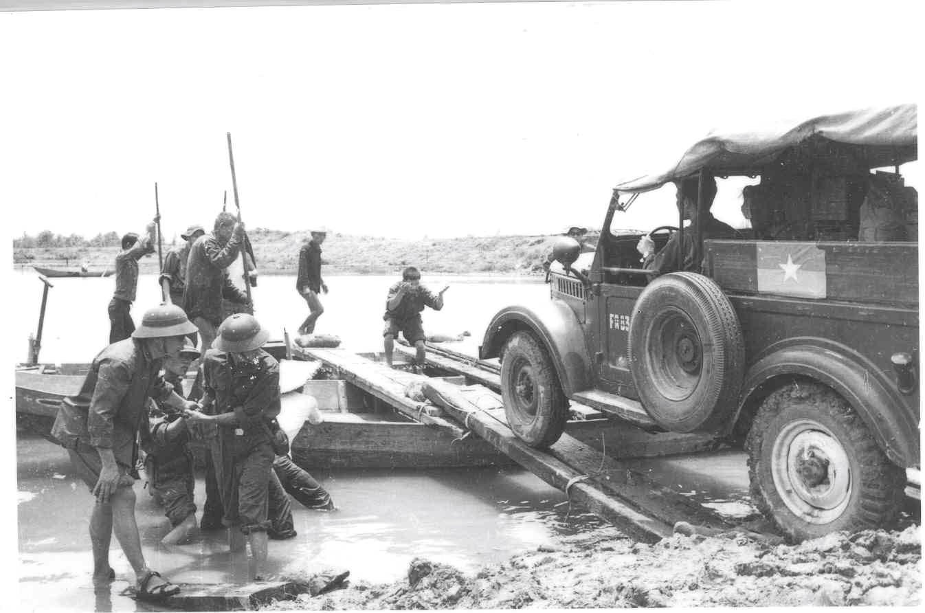 | Tổng biên tập VNTTX Đào Tùng (người ngoài cùng bên trái) cùng đoàn phóng viên ghép ghe làm phà đưa xe qua sông, trên đường vào chiến trường Miền Nam, tháng 4/1975 |