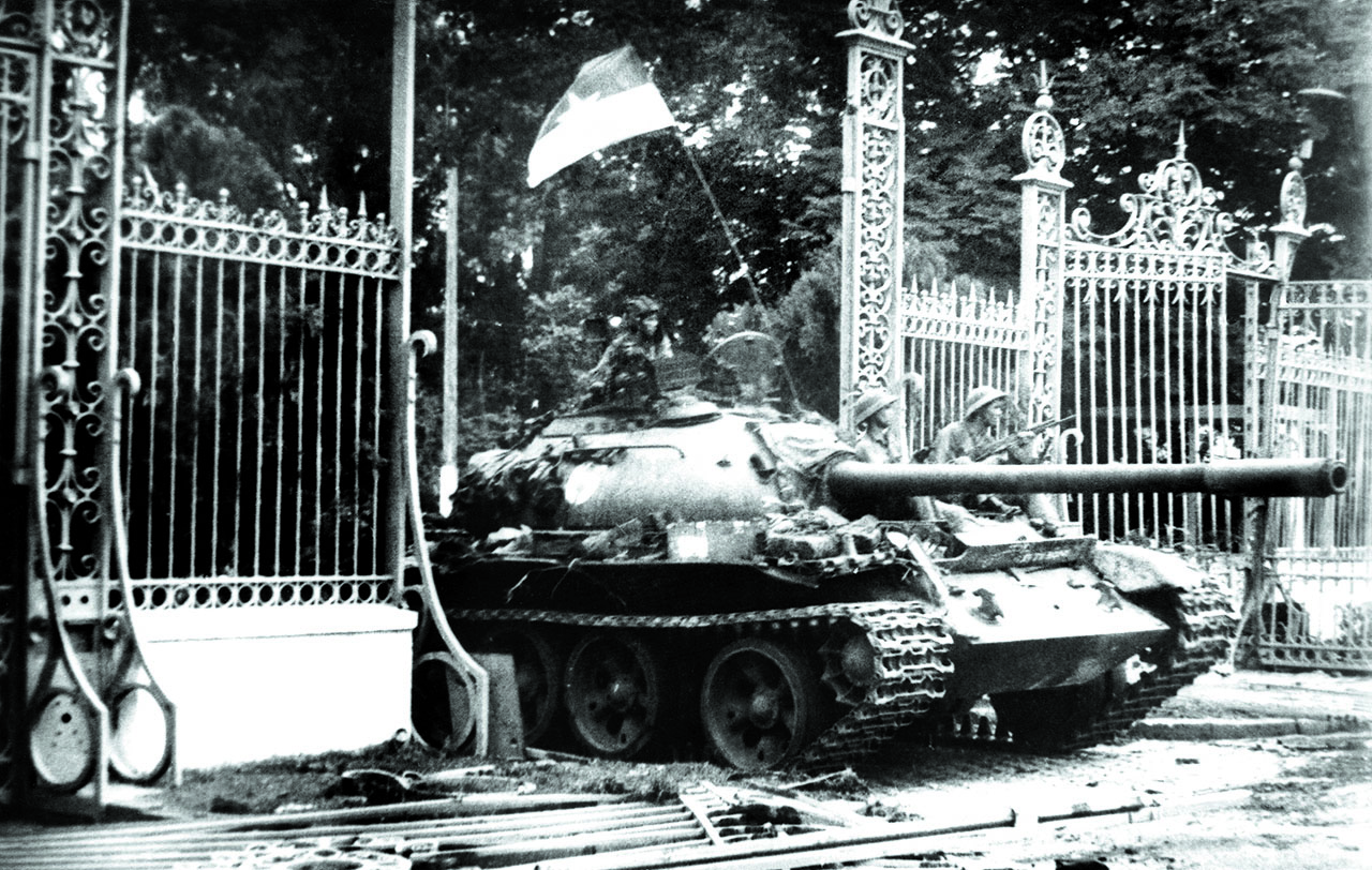 | Xe tăng Quân Giải phóng tiến vào Dinh Độc Lập trưa 30/4/1975. Ảnh: Trần Mai Hưởng |