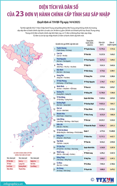 Tin cùng chuyên mục Hà Nội dự kiến còn 126 phường, xã sau sắp xếp: Dự kiến tên gọi, diện tích, dân số 79 xã21/04/2025 09:49Hà Nội (TTXVN 21/4) Ngày 19/4/2025, UBND thành phố Hà Nội có văn bản gửi UBND các quận, huyện, thị xã về phương án sắp xếp đơn vị hành chính cấp xã của thành phố để thực hiện lấy ý kiến nhân dân và tổ chức kỳ họp HĐND các cấp.... Hà Nội dự kiến còn 126 phường, xã sau sắp xếp: Dự kiến tên gọi, diện tích, dân số 47 phường21/04/2025 09:46Hà Nội (TTXVN 20/4) Ngày 19/4/2025, UBND thành phố Hà Nội có văn bản gửi UBND các quận, huyện, thị xã về phương án sắp xếp đơn vị hành chính cấp xã của thành phố để thực hiện lấy ý kiến nhân dân và tổ chức kỳ họp HĐND các cấp.... 7 văn bản thỏa thuận hợp tác trong lĩnh vực đường sắt và đường bộ giữa Việt Nam và Trung Quốc17/04/2025 09:35Hà Nội (TTXVN 16/4) Chiều 14/4/2025, tại trụ sở Trung ương Đảng, sau hội đàm cấp cao, Tổng Bí thư Tô Lâm và Tổng Bí thư, Chủ tịch nước Trung Quốc Tập Cận Bình đã cùng xem và nghe giới thiệu về 45 văn bản thỏa thuận hợp tác trên nhiều lĩnh vực được ký... Diện tích và dân số của 23 đơn vị hành chính cấp tỉnh sau sáp nhập16/04/2025 09:34Hà Nội (TTXVN 15/4) Phó Thủ tướng Thường trực Nguyễn Hòa Bình vừa ký Quyết định số 759/QĐ-TTg ngày 14/4/2025 phê duyệt Đề án sắp xếp, tổ chức lại đơn vị hành chính (ĐVHC) các cấp và xây dựng mô hình tổ chức chính quyền địa phương 2 cấp... Hà Nội: Khung giá cho thuê nhà ở xã hội từ 14/4/202514/04/2025 11:22Hà Nội (TTXVN 14/4) Theo Quyết định số 27/2025/QĐ-UBND của UBND TP Hà Nội, từ 14/4/2025, mức giá cho thuê nhà ở xã hội (được đầu tư xây dựng không bằng vốn đầu tư công, nguồn tài chính công đoàn) trên địa bàn thành phố thấp nhất là... Quan hệ Đối tác hợp tác chiến lược toàn diện Việt Nam-Trung Quốc14/04/2025 11:22Hà Nội (TTXVN 10/4) Nhận lời mời của Tổng Bí thư Ban Chấp hành Trung ương Đảng Cộng sản Việt Nam Tô Lâm, Chủ tịch nước Cộng hòa xã hội chủ nghĩa Việt Nam Lương Cường, Tổng Bí thư Ban Chấp hành Trung ương Đảng Cộng sản Trung Quốc, Chủ tịch nước Cộng hòa nhân dân Trung...