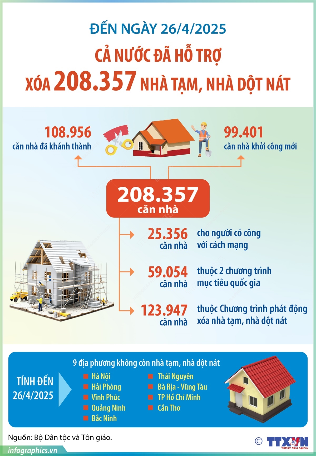 Phổ biến giáo dục Pháp luậtThông tin đồ họa Cả nước có 9 địa phương không còn nhà tạm, nhà dột nát Thứ hai, 28/04/2025 15:35 Hà Nội (TTXVN 28/4) Theo thông tin từ Bộ Dân tộc và Tôn giáo, đến ngày 26/4/2025, cả nước đã hỗ trợ xóa 208.357 nhà tạm, nhà dột nát; trong đó, khánh thành 108.956 căn và khởi công, xây dựng mới 99.401 căn. Trong việc hỗ trợ xóa 208.357 nhà tạm, nhà dột nát nói trên, có 25.356 căn là hỗ trợ nhà ở đối với người có công với cách mạng, 59.054 căn thuộc diện hỗ trợ nhà ở thuộc 2 chương trình mục tiêu Quốc gia và 123.947 căn thuộc Chương trình xóa nhà tạm, nhà dột nát. Cả nước có 9 địa phương không còn nhà tạm, nhà dột nát là: Hà Nội, Hải Phòng, Vĩnh Phúc, Quảng Ninh, Thái Nguyên, Bà Rịa-Vũng Tàu, Bắc Ninh, Thái Nguyên và Cần Thơ.