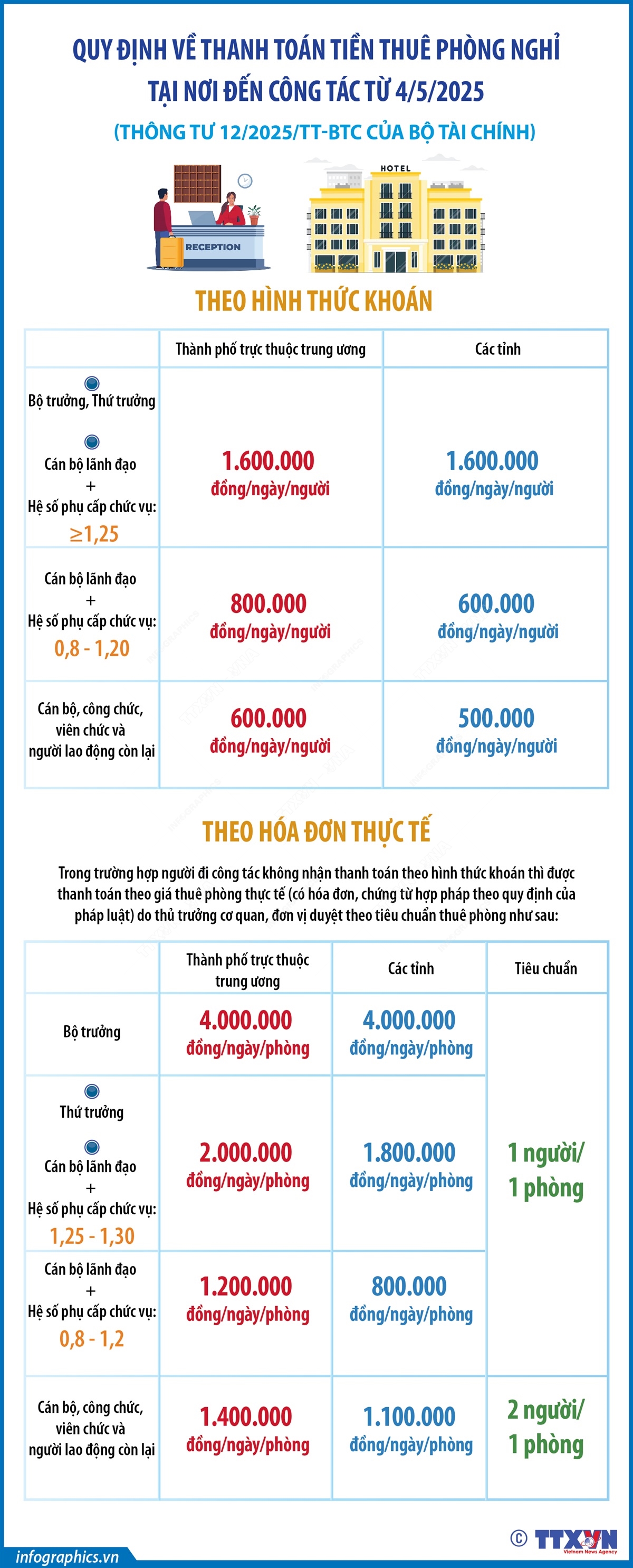Phổ biến giáo dục Pháp luậtThông tin đồ họa Quy định về thanh toán tiền thuê phòng nghỉ tại nơi đến công tác từ 4/5/2025 Thứ hai, 05/05/2025 14:14 Hà Nội (TTXVN 4/5) Theo Thông tư 12/2025/TT-BTC ngày 19/3/2025 của Bộ Tài chính, từ 4/5/2025, mức khoán tiền thuê phòng nghỉ tại nơi đến công tác thấp nhất 500.000 đồng/ngày/người, cao nhất là 1.600.000 đồng/ngày/người; mức thanh toán theo hóa đơn thấp nhất là 1.100.000 đồng/ngày/phòng (tiêu chuẩn 2 người 1 phòng), cao nhất là 4.000.000 đồng/ngày/phòng (tiêu chuẩn 1 người 1 phòng), tùy theo đối tượng và nơi đến công tác.
