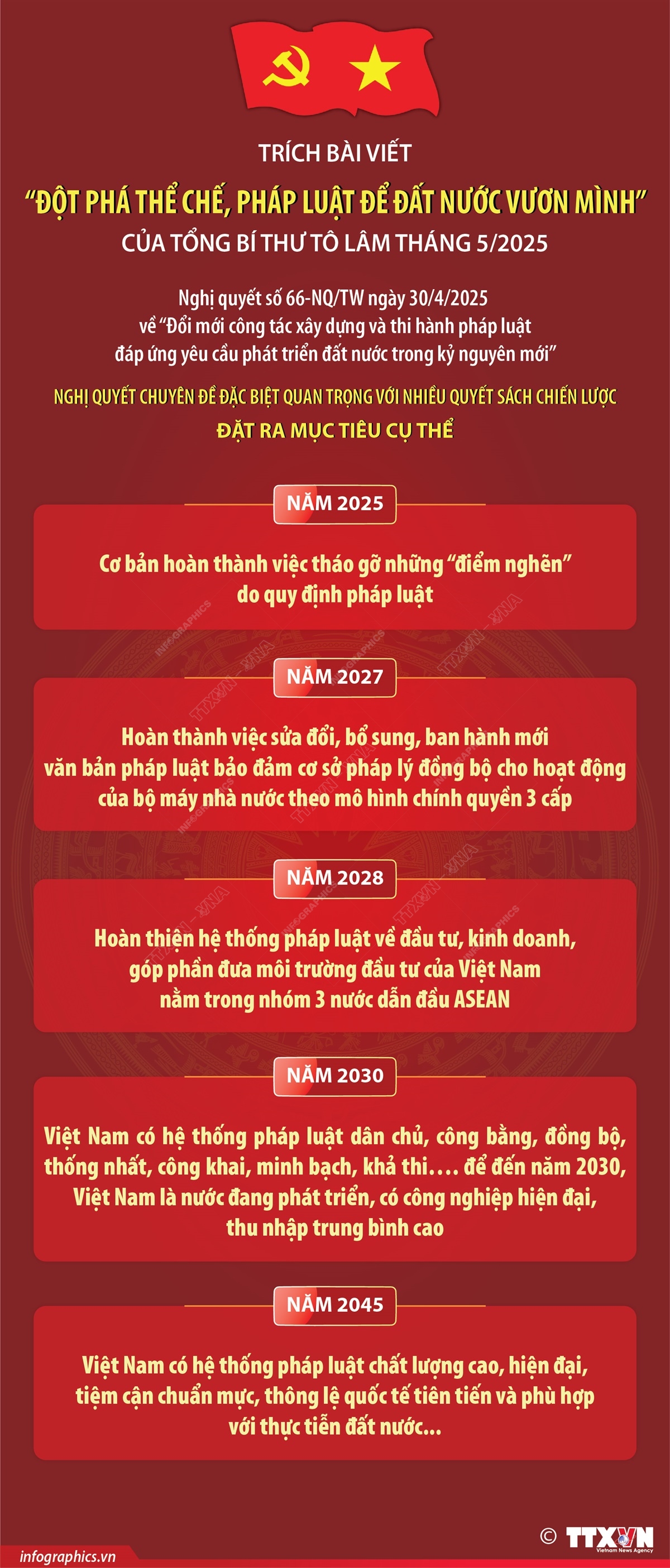 Phổ biến giáo dục Pháp luậtThông tin đồ họa Nghị quyết số 66-NQ/TW: Nghị quyết chuyên đề đặc biệt với nhiều quyết sách chiến lược Thứ hai, 05/05/2025 14:16 Hà Nội (TTXVN 4/5) Ngày 4/5/2025, Tổng Bí thư Tô Lâm viết bài “Đột phá thể chế, pháp luật để đất nước vươn mình”. Trong bài viết, Tổng Bí thư nhấn mạnh: Bộ Chính trị đã ban hành Nghị quyết số 66-NQ/TW ngày 30/4/2025 về “Đổi mới công tác xây dựng và thi hành pháp luật đáp ứng yêu cầu phát triển đất nước trong kỷ nguyên mới” - một Nghị quyết chuyên đề đặc biệt quan trọng với nhiều quyết sách chiến lược. Nghị quyết đặt ra mục tiêu cụ thể, năm 2025, cơ bản hoàn thành việc tháo gỡ những “điểm nghẽn” do quy định pháp luật. Năm 2027, hoàn thành việc sửa đổi, bổ sung, ban hành mới văn bản pháp luật bảo đảm cơ sở pháp lý đồng bộ cho hoạt động của bộ máy nhà nước theo mô hình chính quyền 3 cấp. Năm 2028, hoàn thiện hệ thống pháp luật về đầu tư, kinh doanh, góp phần đưa môi trường đầu tư của Việt Nam nằm trong nhóm 3 nước dẫn đầu ASEAN. Đến năm 2030, Việt Nam có hệ thống pháp luật dân chủ, công bằng, đồng bộ, thống nhất, công khai, minh bạch, khả thi… để đến năm 2030, Việt Nam là nước đang phát triển, có công nghiệp hiện đại, thu nhập trung bình cao. Đến năm 2045, Việt Nam có hệ thống pháp luật chất lượng cao, hiện đại, tiệm cận chuẩn mực, thông lệ quốc tế tiên tiến và phù hợp với thực tiễn đất nước...
