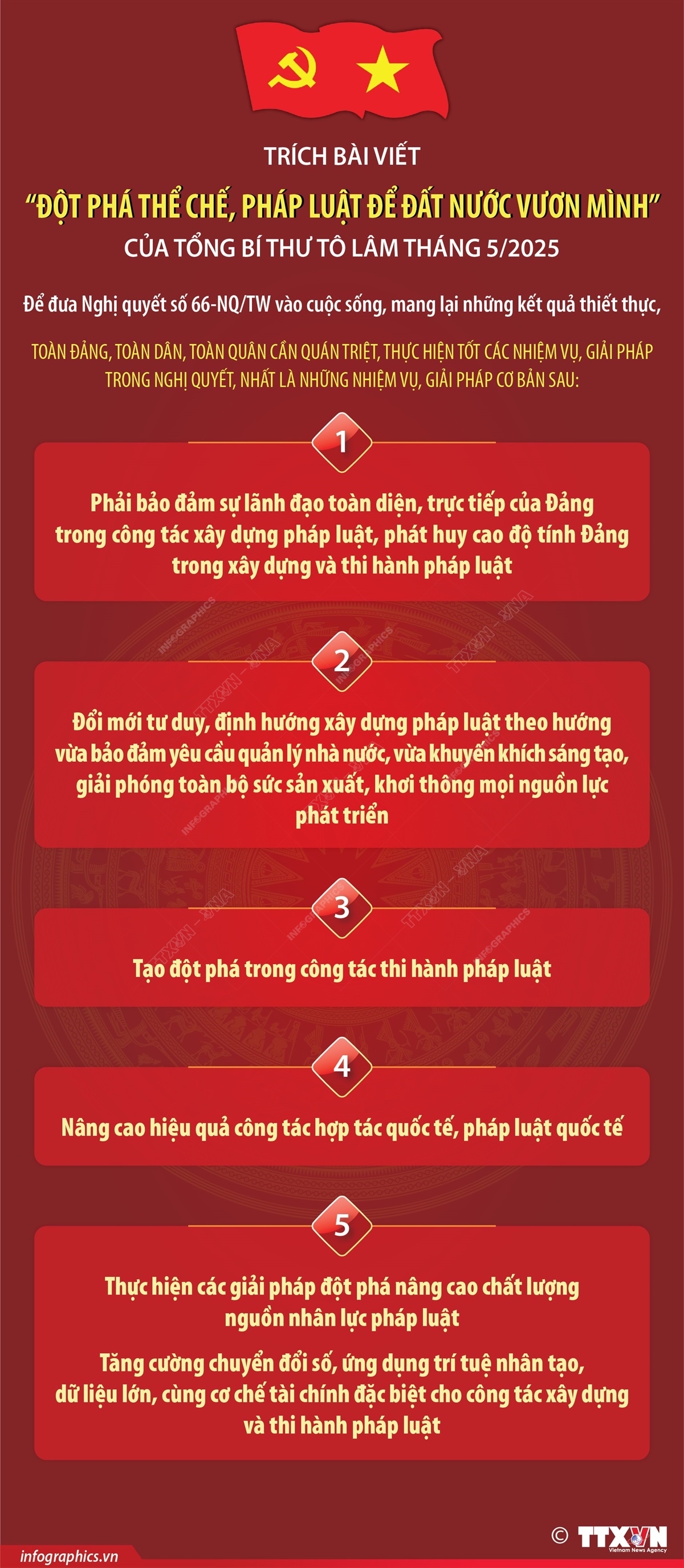 Hà Nội (TTXVN 4/5) Ngày 4/5/2025, Tổng Bí thư Tô Lâm viết bài “Đột phá thể chế, pháp luật để đất nước vươn mình”. Trong bài viết, Tổng Bí thư nhấn mạnh: Bộ Chính trị đã ban hành Nghị quyết số 66-NQ/TW ngày 30/4/2025 về “Đổi mới công tác xây dựng và thi hành pháp luật đáp ứng yêu cầu phát triển đất nước trong kỷ nguyên mới” - một Nghị quyết chuyên đề đặc biệt quan trọng với nhiều quyết sách chiến lược. Để đưa Nghị quyết số 66-NQ/TW vào cuộc sống, mang lại những kết quả thiết thực, toàn Đảng, toàn dân, toàn quân cần quán triệt, thực hiện tốt các nhiệm vụ, giải pháp trong Nghị quyết, nhất là những nhiệm vụ, giải pháp cơ bản sau: Thứ nhất, phải bảo đảm sự lãnh đạo toàn diện, trực tiếp của Đảng trong công tác xây dựng pháp luật, phát huy cao độ tính Đảng trong xây dựng và thi hành pháp luật. Thứ hai, đổi mới tư duy, định hướng xây dựng pháp luật theo hướng vừa bảo đảm yêu cầu quản lý nhà nước, vừa khuyến khích sáng tạo, giải phóng toàn bộ sức sản xuất, khơi thông mọi nguồn lực phát triển. Thứ ba, tạo đột phá trong công tác thi hành pháp luật. Thứ tư, nâng cao hiệu quả công tác hợp tác quốc tế, pháp luật quốc tế. Thứ năm, thực hiện các giải pháp đột phá nâng cao chất lượng nguồn nhân lực pháp luật; tăng cường chuyển đổi số, ứng dụng trí tuệ nhân tạo, dữ liệu lớn, cùng cơ chế tài chính đặc biệt cho công tác xây dựng và thi hành pháp luật.
