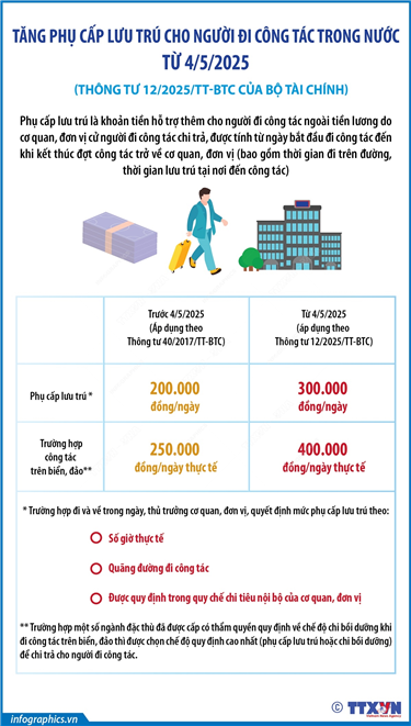 Tin cùng chuyên mục Dự thi tuyển dụng công chức, viên chức, thi nâng ngạch công chức: Trường hợp thí sinh đến muộn không quá 5 phút được dự thi05/05/2025 14:17Hà Nội (TTXVN 2/5) Theo khoản 1 Điều 1 Thông tư 001/2025/TT-BNV ngày 17/3/2025 của Bộ Nội vụ, từ ngày 1/5/2025, thí sinh dự thi tuyển dụng công chức, viên chức, thi nâng ngạch công chức phải có mặt tại phòng thi đúng giờ quy định. Thí sinh dự thi đến muộn sau... Nghị quyết số 66-NQ/TW: Nghị quyết chuyên đề đặc biệt với nhiều quyết sách chiến lược05/05/2025 14:16Hà Nội (TTXVN 4/5) Ngày 4/5/2025, Tổng Bí thư Tô Lâm viết bài “Đột phá thể chế, pháp luật để đất nước vươn mình”. Trong bài viết, Tổng Bí thư nhấn mạnh: Bộ Chính trị đã ban hành Nghị quyết số 66-NQ/TW ngày 30/4/2025 về “Đổi mới công... Những nhiệm vụ và giải pháp cơ bản để đưa Nghị quyết số 66-NQ/TW vào cuộc sống05/05/2025 14:16Hà Nội (TTXVN 4/5) Ngày 4/5/2025, Tổng Bí thư Tô Lâm viết bài “Đột phá thể chế, pháp luật để đất nước vươn mình”. Trong bài viết, Tổng Bí thư nhấn mạnh: Bộ Chính trị đã ban hành Nghị quyết số 66-NQ/TW ngày 30/4/2025 về “Đổi mới công... Nghị quyết số 66-NQ/TW: Tạo ra một xã hội thực sự dân chủ, bình đẳng, an toàn, minh bạch05/05/2025 14:15Hà Nội (TTXVN 4/5) Ngày 4/5/2025, Tổng Bí thư Tô Lâm viết bài “Đột phá thể chế, pháp luật để đất nước vươn mình”. Trong bài viết, Tổng Bí thư nhấn mạnh: Bộ Chính trị đã ban hành Nghị quyết số 66-NQ/TW ngày 30/4/2025 về “Đổi mới công... Quy định về thanh toán tiền thuê phòng nghỉ tại nơi đến công tác từ 4/5/202505/05/2025 14:14Hà Nội (TTXVN 4/5) Theo Thông tư 12/2025/TT-BTC ngày 19/3/2025 của Bộ Tài chính, từ 4/5/2025, mức khoán tiền thuê phòng nghỉ tại nơi đến công tác thấp nhất 500.000 đồng/ngày/người, cao nhất là 1.600.000 đồng/ngày/người; mức thanh toán theo hóa... Tăng phụ cấp lưu trú cho người đi công tác trong nước từ 4/5/202505/05/2025 14:13Hà Nội (TTXVN 4/5) Theo Thông tư 12/2025/TT-BTC ngày 19/3/2025 của Bộ Tài chính, từ 4/5/2025, mức phụ cấp lưu trú để chi trả cho người đi công tác tăng từ 200.000 lên 300.000 đồng/ngày. Phụ cấp lưu trú là khoản tiền hỗ trợ thêm cho người đi công...