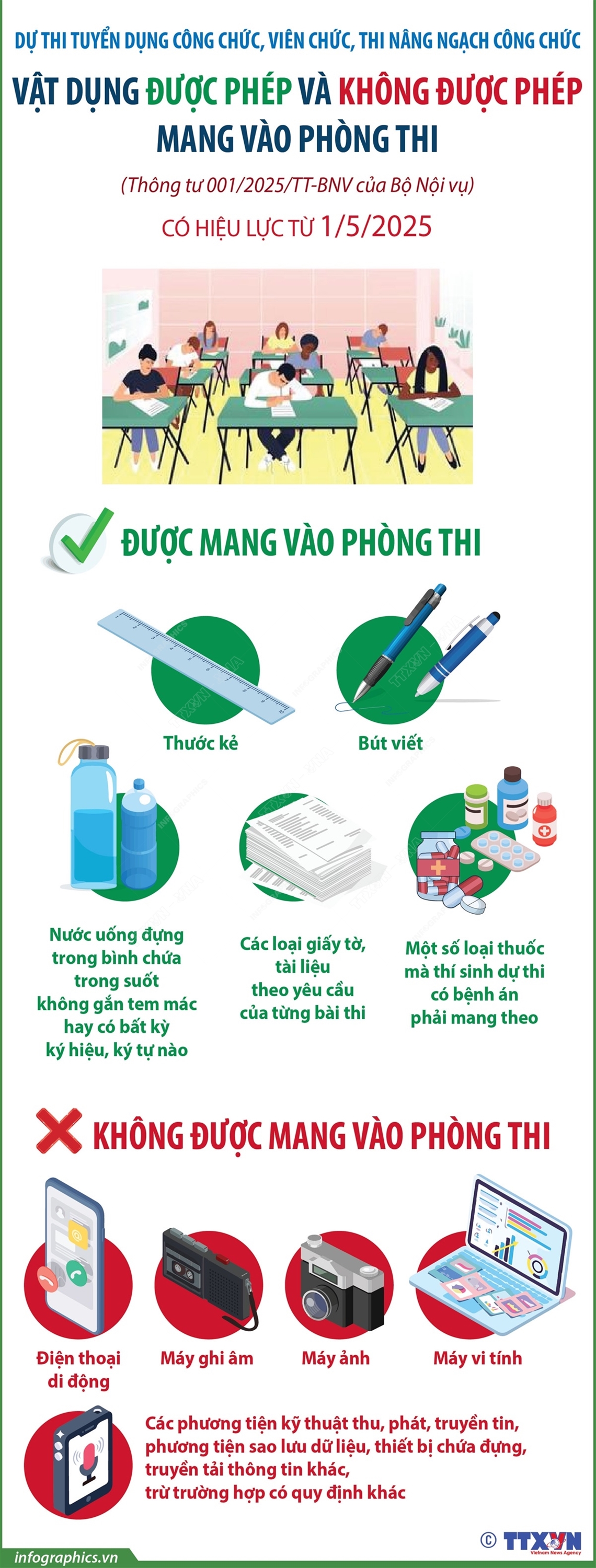Phổ biến giáo dục Pháp luậtThông tin đồ họa Dự thi tuyển dụng công chức, viên chức, thi nâng ngạch công chức: Vật dụng được phép và không được phép mang vào phòng thi Thứ hai, 05/05/2025 14:19 Hà Nội (TTXVN 2/5) Theo khoản 1 Điều 1 Thông tư001/2025/TT-BNV ngày 17/3/2025 của Bộ Nội vụ, từ ngày1/5/2025, thí sinh dự thi tuyển dụng công chức, viên chức, thinâng ngạch công chức phải có mặt tại phòng thi đúng giờ quyđịnh. Thí sinh không được mang vào phòng thi điện thoại di động, máy ghi âm, máy ảnh, máy vi tính; các phương tiện kỹ thuật thu, phát, truyền tin, phương tiện sao lưu dữ liệu, thiết bị chứa đựng, truyền tải thông tin khác, trừ trường hợp có quy định khác