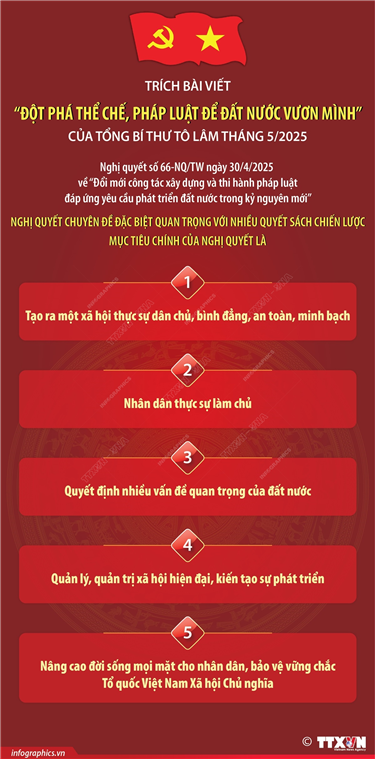 Tin cùng chuyên mục Từ 1/5/2025: Trẻ em học tại nhà trẻ bán trú thuộc vùng khó khăn được hỗ trợ tiền ăn trưa05/05/2025 14:20Hà Nội (TTXVN 3/5) Điểm mới đáng chú ý nhất của Nghị định số 66/2025/NĐ-CP là đã bổ sung trẻ em nhà trẻ bán trú (từ 3 tháng tuổi đến 3 tuổi) vào diện được thụ hưởng chính sách hỗ trợ chăm sóc từ nguồn ngân sách nhà nước. Sự bổ... Dự thi tuyển dụng công chức, viên chức, thi nâng ngạch công chức: Vật dụng được phép và không được phép mang vào phòng thi05/05/2025 14:19Hà Nội (TTXVN 2/5) Theo khoản 1 Điều 1 Thông tư001/2025/TT-BNV ngày 17/3/2025 của Bộ Nội vụ, từ ngày1/5/2025, thí sinh dự thi tuyển dụng công chức, viên chức, thinâng ngạch công chức phải có mặt tại phòng thi đúng giờ quyđịnh. Thí sinh không được mang... Dự thi tuyển dụng công chức, viên chức, thi nâng ngạch công chức: Trường hợp thí sinh đến muộn không quá 5 phút được dự thi05/05/2025 14:17Hà Nội (TTXVN 2/5) Theo khoản 1 Điều 1 Thông tư 001/2025/TT-BNV ngày 17/3/2025 của Bộ Nội vụ, từ ngày 1/5/2025, thí sinh dự thi tuyển dụng công chức, viên chức, thi nâng ngạch công chức phải có mặt tại phòng thi đúng giờ quy định. Thí sinh dự thi đến muộn sau... Nghị quyết số 66-NQ/TW: Nghị quyết chuyên đề đặc biệt với nhiều quyết sách chiến lược05/05/2025 14:16Hà Nội (TTXVN 4/5) Ngày 4/5/2025, Tổng Bí thư Tô Lâm viết bài “Đột phá thể chế, pháp luật để đất nước vươn mình”. Trong bài viết, Tổng Bí thư nhấn mạnh: Bộ Chính trị đã ban hành Nghị quyết số 66-NQ/TW ngày 30/4/2025 về “Đổi mới công... Những nhiệm vụ và giải pháp cơ bản để đưa Nghị quyết số 66-NQ/TW vào cuộc sống05/05/2025 14:16Hà Nội (TTXVN 4/5) Ngày 4/5/2025, Tổng Bí thư Tô Lâm viết bài “Đột phá thể chế, pháp luật để đất nước vươn mình”. Trong bài viết, Tổng Bí thư nhấn mạnh: Bộ Chính trị đã ban hành Nghị quyết số 66-NQ/TW ngày 30/4/2025 về “Đổi mới công... Nghị quyết số 66-NQ/TW: Tạo ra một xã hội thực sự dân chủ, bình đẳng, an toàn, minh bạch05/05/2025 14:15Hà Nội (TTXVN 4/5) Ngày 4/5/2025, Tổng Bí thư Tô Lâm viết bài “Đột phá thể chế, pháp luật để đất nước vươn mình”. Trong bài viết, Tổng Bí thư nhấn mạnh: Bộ Chính trị đã ban hành Nghị quyết số 66-NQ/TW ngày 30/4/2025 về “Đổi mới công...