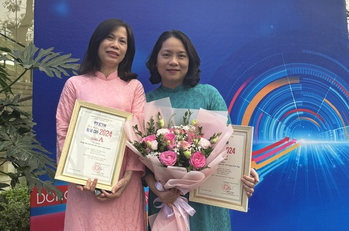 | Nhóm tác giả Đinh Thuận và Hồng Điệp, Ban biên tập tin Trong nước nhận giải A tại Lễ trao Giải báo chí TTXVN năm 2024, ngày 25/4 |