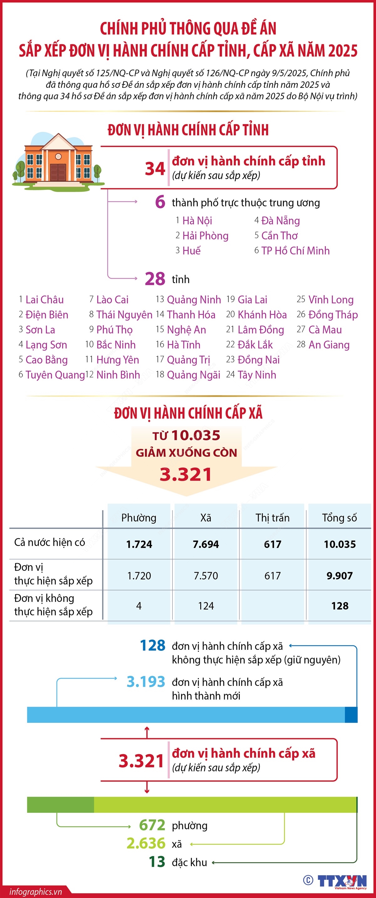 Hà Nội (TTXVN 11/5) Tại Nghị quyết số 125/NQ-CP và Nghị quyết số 126/NQ-CP ngày 9/5/2025, Chính phủ đã thông qua hồ sơ Đề án sắp xếp đơn vị hành chính cấp tỉnh năm 2025 và thông qua 34 hồ sơ Đề án sắp xếp đơn vị hành chính cấp xã năm 2025 do Bộ Nội vụ trình. Theo đó, cả nước có 34 đơn vị hành chính (ĐVHC) cấp tỉnh gồm 6 thành phố trực thuộc trung ương (Hà Nội, Hải Phòng, Huế, Đà Nẵng, Cần Thơ và Thành phố Hồ Chí Minh) và 28 tỉnh (gồm: Lai Châu, Điện Biên, Sơn La, Lạng Sơn, Cao Bằng, Tuyên Quang, Lào Cai, Thái Nguyên, Phú Thọ, Bắc Ninh, Hưng Yên, Ninh Bình, Quảng Ninh, Thanh Hoá, Nghệ An, Hà Tĩnh, Quảng Trị, Quảng Ngãi, Gia Lai, Khánh Hòa, Lâm Đồng, Đắk Lắk, Đồng Nai, Tây Ninh, Vĩnh Long, Đồng Tháp, Cà Mau, An Giang). Sau khi thực hiện sắp xếp ĐVHC cấp xã năm 2025, cả nước còn tổng số 3.321 ĐVHC cấp xã (2.636 xã, 672 phường và 13 đặc khu). Trong đó có 3.193 ĐVHC cấp xã hình thành mới do sắp xếp, sáp nhập, điều chỉnh ĐVHC cấp xã và 128 ĐVHC không thực hiện sắp xếp (giữ nguyên), giảm 6.714 ĐVHC cấp xã (từ 10.035 xuống còn 3.321) so với trước khi sắp xếp ĐVHC cấp xã (đạt tỉ lệ giảm 66,91%).