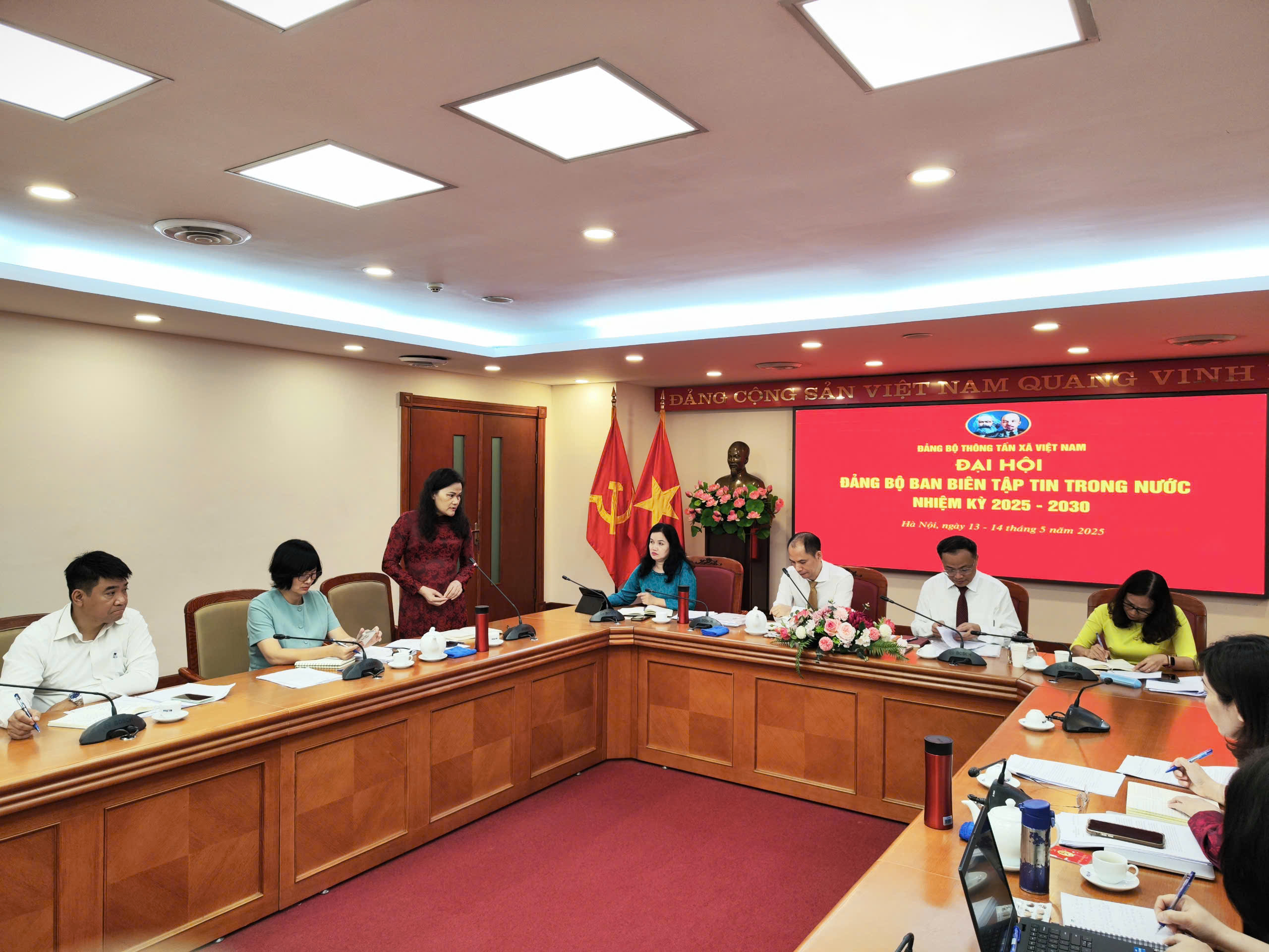 | Phó tổng giám đốc TTXVN Nguyễn Thị Sự chúc mừng Ban chấp hành Đảng bộ Ban biên tập tin Trong nước nhiệm kỳ 2025-2030, ngày 14/5 |