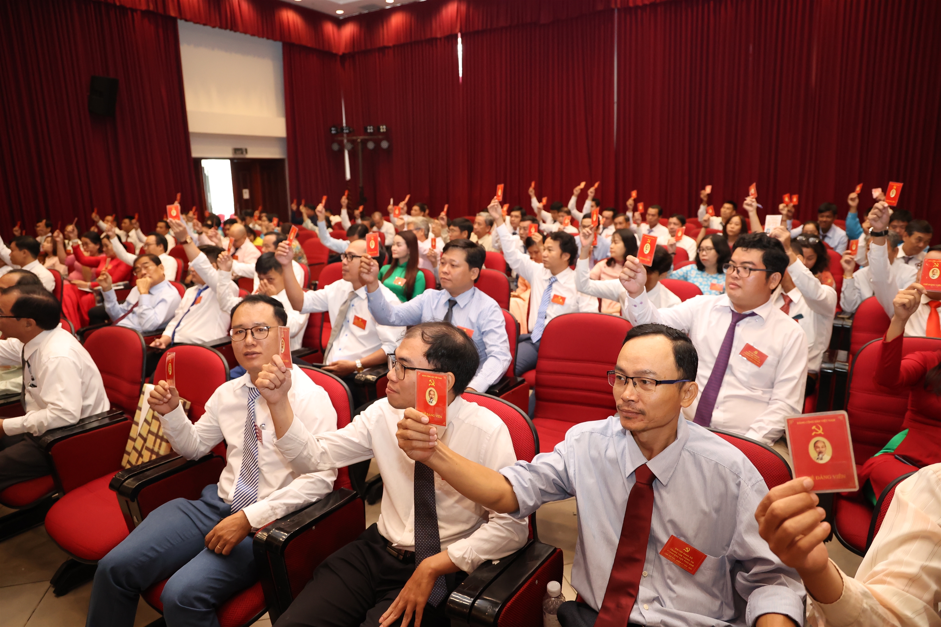 | Các đại biểu biểu quyết thông qua Nghị quyết Đại hội Đảng bộ Trung tâm Thông tin TTXVN khu vực phía Nam nhiệm kỳ 2025-2030, ngày 17/5 |