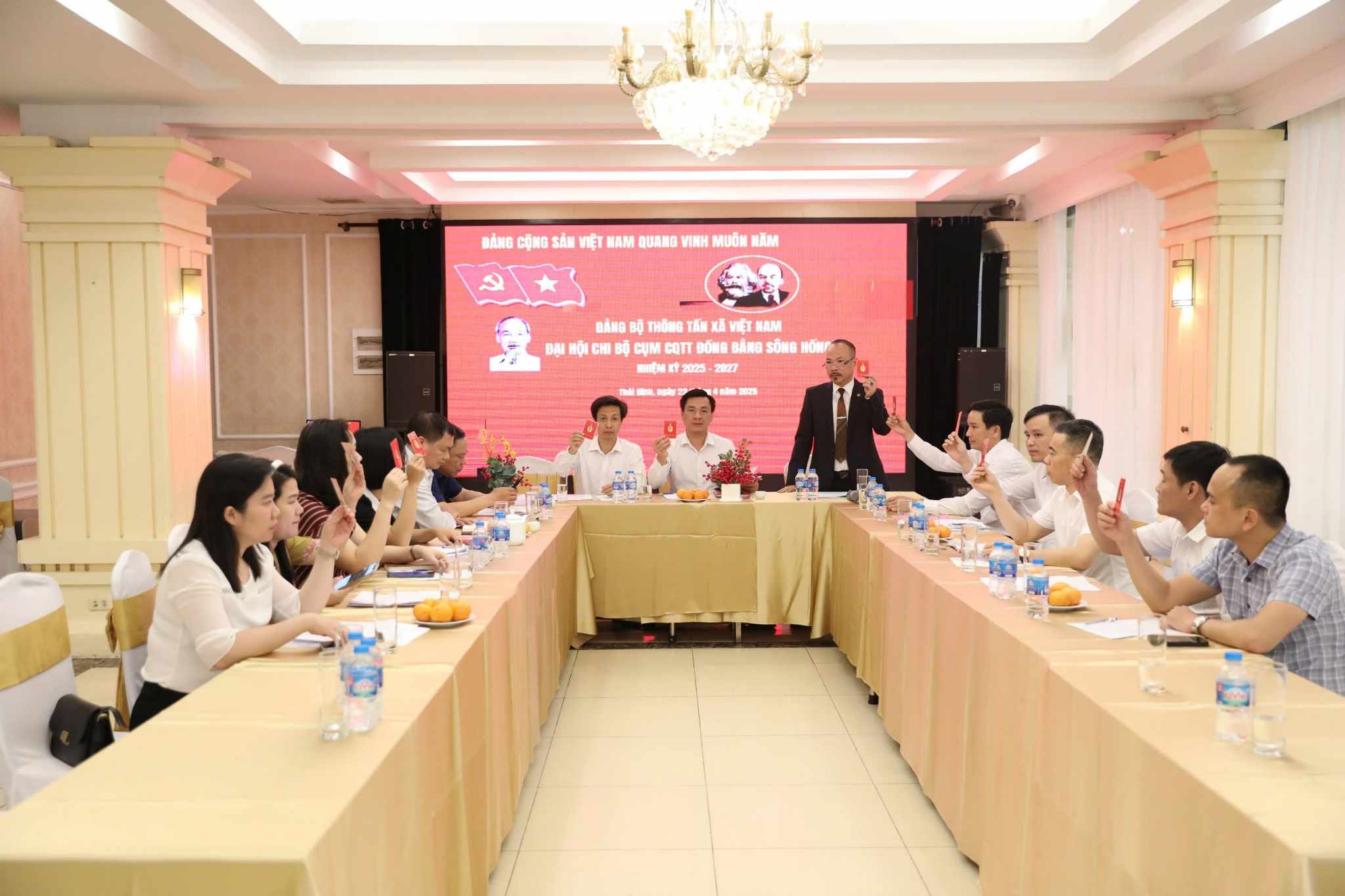 | Biểu quyết thông qua Nghị quyết Đại hội Chi bộ cụm CQTT Đồng bằng sông Hồng nhiệm kỳ 2025-2027, ngày 22/4 |