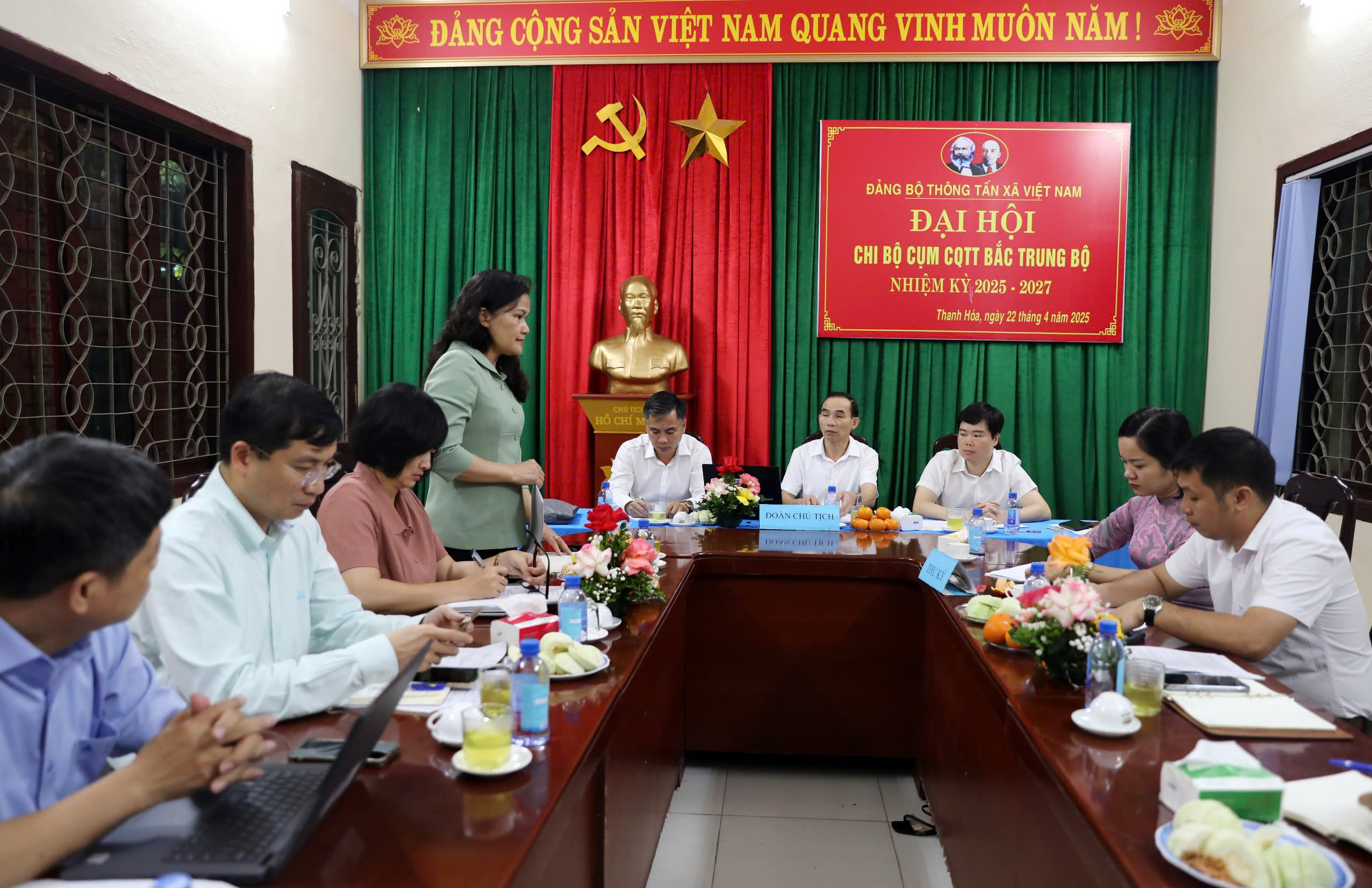 | Phó tổng giám đốc TTXVN Nguyễn Thị Sự phát biểu chỉ đạo Đại hội Chi bộ cụm CQTT Bắc Trung bộ nhiệm kỳ 2025-2027, ngày 22/4 |