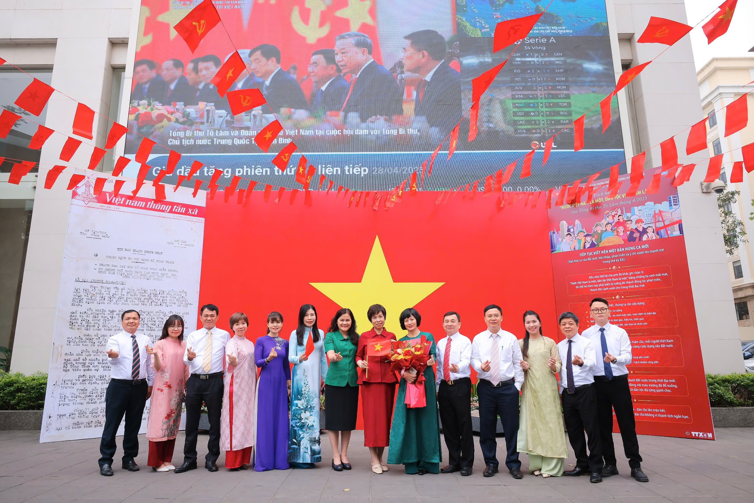 | Bí thư Đảng ủy, Tổng giám đốc TTXVN Vũ Việt Trang, Phó tổng giám đốc Nguyễn Thị Sự cùng các đảng viên Chi bộ Khối chuyên trách, ngày 29/4 |