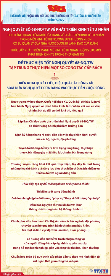 Tin cùng chuyên mục Hướng dẫn chi tiết 5 bước lấy ý kiến nhân dân sửa đổi Hiến pháp năm 2013 trên VNeID19/05/2025 10:01Hà Nội (TTXVN 16/5) Quốc hội tổ chức lấy ý kiến Nhân dân, các ngành, các cấp về dự thảo Nghị quyết sửa đổi, bổ sung một số điều của Hiến pháp nước Cộng hòa xã hội chủ nghĩa Việt Nam năm 2013 từ ngày 6/5 đến ngày 5/6/2025. Người dân có thể góp... Chính phủ thông qua Đề án sắp xếp đơn vị hành chính cấp tỉnh, cấp xã năm 202512/05/2025 09:51Hà Nội (TTXVN 11/5) Tại Nghị quyết số 125/NQ-CP và Nghị quyết số 126/NQ-CP ngày 9/5/2025, Chính phủ đã thông qua hồ sơ Đề án sắp xếp đơn vị hành chính cấp tỉnh năm 2025 và thông qua 34 hồ sơ Đề án sắp xếp đơn vị hành chính cấp xã năm 2025 do Bộ... Bốn nhiệm vụ cấp bách triển khai Nghị quyết số 68-NQ/TW về phát triển kinh tế tư nhân (phần 4 và hết)12/05/2025 09:50Hà Nội (TTXVN 11/5) Trong bài viết “Động lực mới cho phát triển kinh tế”, Tổng Bí thư Tô Lâm chỉ rõ: Ngày 4/5/2025, Bộ Chính trị ban hành Nghị quyết số 68-NQ/TW về phát triển kinh tế tư nhân, với các mục tiêu, quan điểm, nhiệm vụ, giải pháp đột... Bốn nhiệm vụ cấp bách triển khai Nghị quyết số 68-NQ/TW về phát triển kinh tế tư nhân (phần 3)12/05/2025 09:49Hà Nội (TTXVN 11/5) Trong bài viết “Động lực mới cho phát triển kinh tế”, Tổng Bí thư Tô Lâm chỉ rõ: Ngày 4/5/2025, Bộ Chính trị ban hành Nghị quyết số 68-NQ/TW về phát triển kinh tế tư nhân, với các mục tiêu, quan điểm, nhiệm vụ, giải pháp đột... Bốn nhiệm vụ cấp bách triển khai Nghị quyết số 68-NQ/TW về phát triển kinh tế tư nhân (phần 2)12/05/2025 09:47Hà Nội (TTXVN 11/5) Trong bài viết “Động lực mới cho phát triển kinh tế”, Tổng Bí thư Tô Lâm chỉ rõ: Ngày 4/5/2025, Bộ Chính trị ban hành Nghị quyết số 68-NQ/TW về phát triển kinh tế tư nhân, với các mục tiêu, quan điểm, nhiệm vụ, giải pháp đột... Bốn nhiệm vụ cấp bách triển khai Nghị quyết số 68-NQ/TW về phát triển kinh tế tư nhân (phần 1)12/05/2025 09:46Hà Nội (TTXVN 11/5) Trong bài viết “Động lực mới cho phát triển kinh tế”, Tổng Bí thư Tô Lâm chỉ rõ: Ngày 4/5/2025, Bộ Chính trị ban hành Nghị quyết số 68-NQ/TW về phát triển kinh tế tư nhân, với các mục tiêu, quan điểm, nhiệm vụ, giải pháp đột...