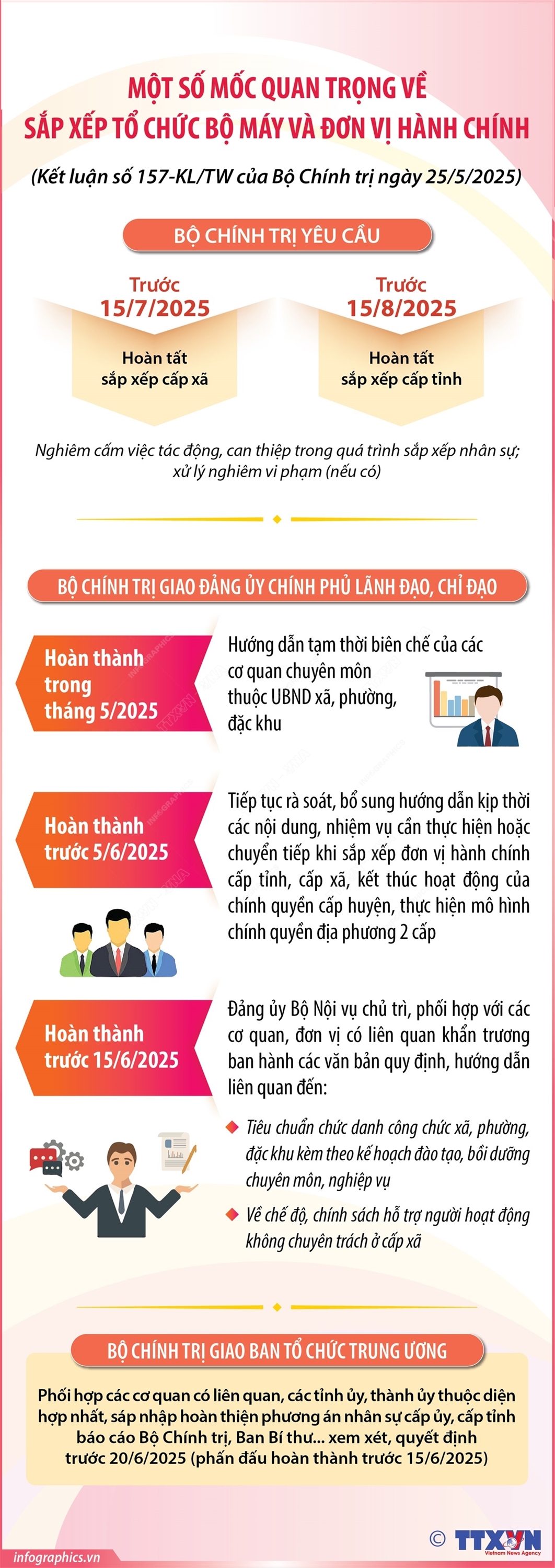 Phổ biến giáo dục Pháp luậtThông tin đồ họa Một số mốc quan trọng về sắp xếp tổ chức bộ máy và đơn vị hành chính Thứ ba, 27/05/2025 11:48 Hà Nội (TTXVN 27/5) Ngày 25/5/2025, thay mặt Bộ Chính trị, đồng chí Trần Cẩm Tú ký ban hành Kết luận số 157-KL/TW của Bộ Chính trị về triển khai thực hiện các nghị quyết, kết luận của Trung ương, Bộ Chính trị về sắp xếp tổ chức bộ máy và đơn vị hành chính. Theo đó, Bộ Chính trị yêu cầu đưa vào hoạt động cấp xã mới từ ngày 1/7/2025, phấn đấu hoàn thành trước ngày 15/7/2025. Cấp tỉnh phấn đấu hoàn thành trước ngày 15/8/2025. Nghiêm cấm việc tác động, can thiệp trong quá trình sắp xếp nhân sự; xử lý nghiêm vi phạm (nếu có).