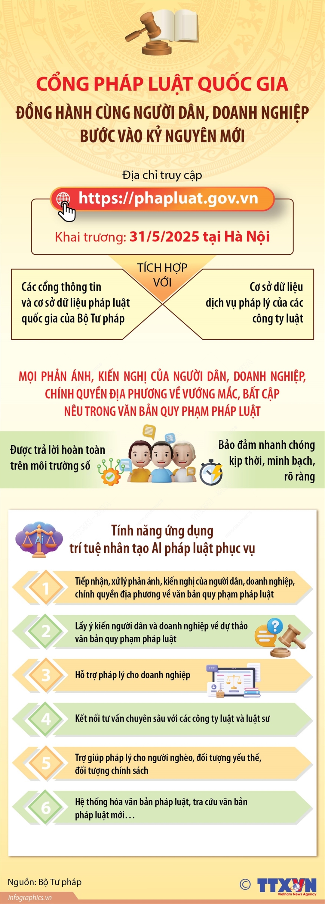 Phổ biến giáo dục Pháp luậtThông tin đồ họa Cổng Pháp luật quốc gia: Đồng hành cùng người dân, doanh nghiệp bước vào kỷ nguyên mới Thứ tư, 04/06/2025 09:34 Hà Nội (TTXVN 2/6) Cổng Pháp luật quốc gia có địa chỉ truy cập https://phapluat.gov.vn được chính thức đưa vào hoạt động từ ngày 31/5/2025. Đây là kênh thông tin cung cấp cơ bản đầy đủ hệ thống văn bản quy phạm pháp luật, giới thiệu văn bản pháp luật mới, là “cẩm nang pháp lý” trực tuyến; tiếp nhận, xử lý phản ánh, kiến nghị của người dân, doanh nghiệp về văn bản quy phạm pháp luật; ứng dụng trí tuệ nhân tạo (AI) để hỗ trợ, giải đáp các vấn đề về pháp luật; lấy ý kiến người dân và doanh nghiệp về dự thảo văn bản quy phạm pháp luật; hỗ trợ pháp lý doanh nghiệp; trợ giúp pháp lý... Đặc biệt, thông qua Cổng pháp luật quốc gia, mọi phản ánh, kiến nghị của người dân, doanh nghiệp, chính quyền địa phương về vướng mắc, bất cập nêu trong văn bản quy phạm pháp luật sẽ được trả lời hoàn toàn trên môi trường số, bảo đảm nhanh chóng kịp thời, minh bạch và rõ ràng. Việc tích hợp các chức năng cốt lõi trên cùng một nền tảng sẽ tạo ra một hệ sinh thái pháp lý toàn diện, thân thiện và hiệu quả, đáp ứng ngày càng tốt hơn nhu cầu của người dân và doanh nghiệp trong kỷ nguyên số.