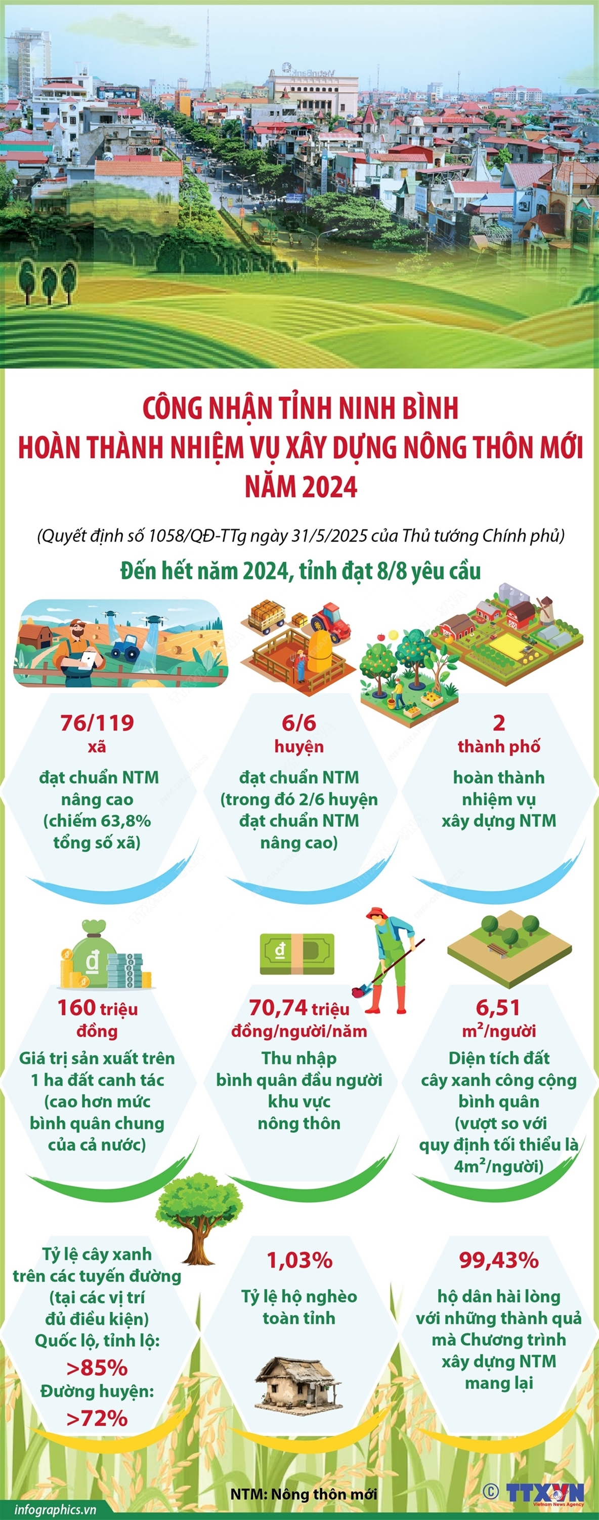 Phổ biến giáo dục Pháp luậtThông tin đồ họa Công nhận tỉnh Ninh Bình hoàn thành nhiệm vụ xây dựng nông thôn mới năm 2024 Thứ tư, 04/06/2025 10:20 Hà Nội (TTXVN 3/6) Tại Quyết định số 1058/QĐ-TTg ngày 31/5/2025, Thủ tướng Chính phủ công nhận tỉnh Ninh Bình hoàn thành nhiệm vụ xây dựng nông thôn mới năm 2024. Từ năm 2011, tỉnh Ninh Bình đã triển khai Chương trình mục tiêu quốc gia xây dựng nông thôn mới một cách quyết liệt. Tính đến hết năm 2024, tỉnh Ninh Bình đã đạt 8/8 yêu cầu của tỉnh hoàn thành nhiệm vụ xây dựng nông thôn mới. Chương trình mục tiêu quốc gia xây dựng nông thôn mới đã thay đổi đáng kể diện mạo nông thôn Ninh Bình. Hạ tầng kinh tế - xã hội được đầu tư đồng bộ và hoàn thiện. Đời sống của người dân ngày càng được nâng cao. Công tác bảo vệ môi trường nông thôn có những bước tiến vượt bậc, tạo nên cảnh quan xanh, sạch, đẹp. Theo kết quả khảo sát, có tới 99,43% số hộ dân hài lòng với những thành quả mà Chương trình xây dựng nông thôn mới mang lại.