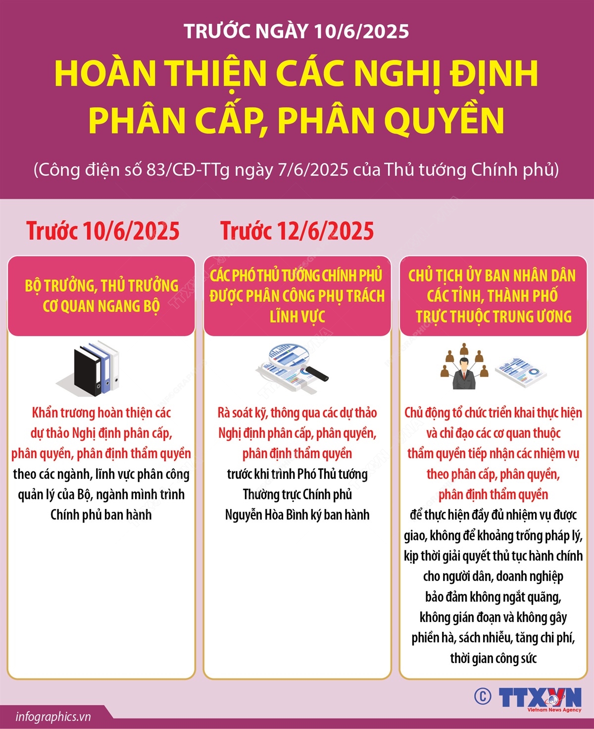 Phổ biến giáo dục Pháp luậtThông tin đồ họa Trước ngày 10/6/2025, hoàn thiện các Nghị định phân cấp, phân quyền Thứ hai, 09/06/2025 09:47 Hà Nội (TTXVN 8/6) Thủ tướng Chính phủ Phạm Minh Chính yêu cầu Bộ trưởng, Thủ trưởng cơ quan ngang Bộ khẩn trương hoàn thiện các dự thảo Nghị định phân cấp, phân quyền, phân định thẩm quyền theo các ngành, lĩnh vực phân công quản lý của Bộ, ngành mình trình Chính phủ ban hành; thời gian hoàn thành trước ngày 10/6/2025 - Đó là nội dung tại Công điện số 83/CĐ-TTg ngày 7/6/2025 của Thủ tướng Chính phủ về việc tiếp tục đẩy mạnh phân cấp, phân quyền; phân định thẩm quyền trong các ngành, lĩnh vực.