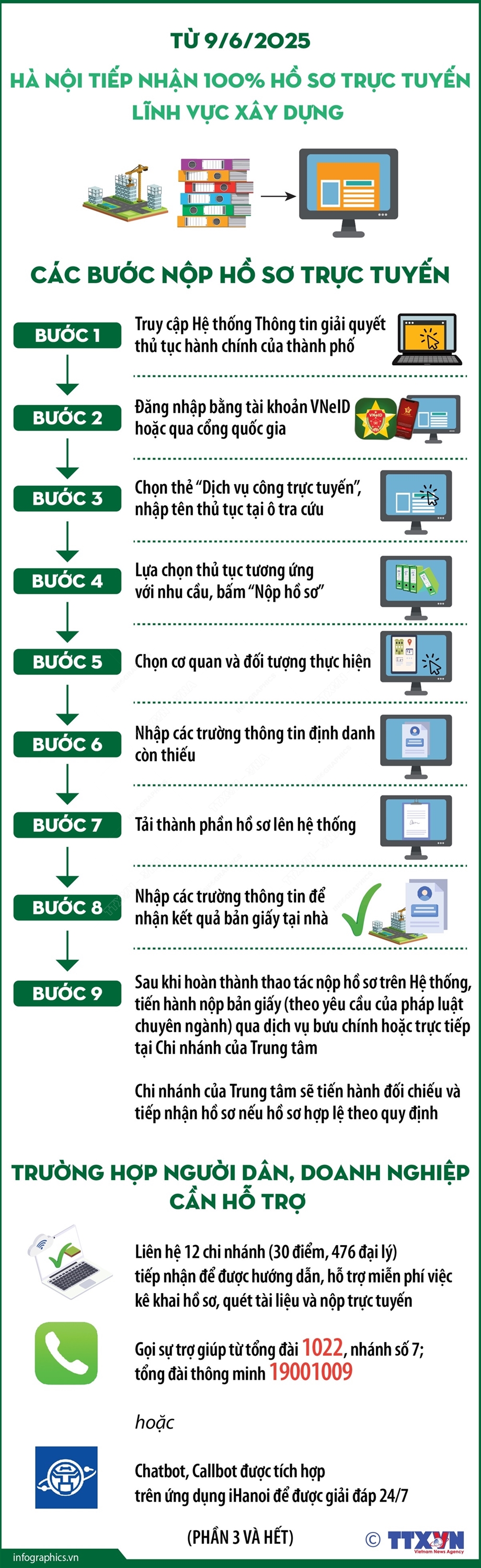 Phổ biến giáo dục Pháp luậtThông tin đồ họa Từ 9/6/2025, Hà Nội tiếp nhận 100% hồ sơ trực tuyến lĩnh vực xây dựng (Phần 3 và hết) Thứ hai, 09/06/2025 09:51 Hà Nội (TTXVN 9/6) Từ ngày 9/6/2025, Trung tâm Phục vụ hành chính công thành phố Hà Nội chính thức tiếp nhận 100% hồ sơ trực tuyến và trực tuyến toàn trình đối với các thủ tục hành chính thuộc lĩnh vực hoạt động xây dựng. Việc triển khai nhằm góp phần đạt mục tiêu đến năm 2030, tỷ lệ sử dụng dịch vụ công trực tuyến đạt trên 80%; đồng thời, tạo nền tảng cho việc cắt giảm quy trình, thủ tục cấp giấy phép xây dựng theo chỉ đạo của Thủ tướng Chính phủ.