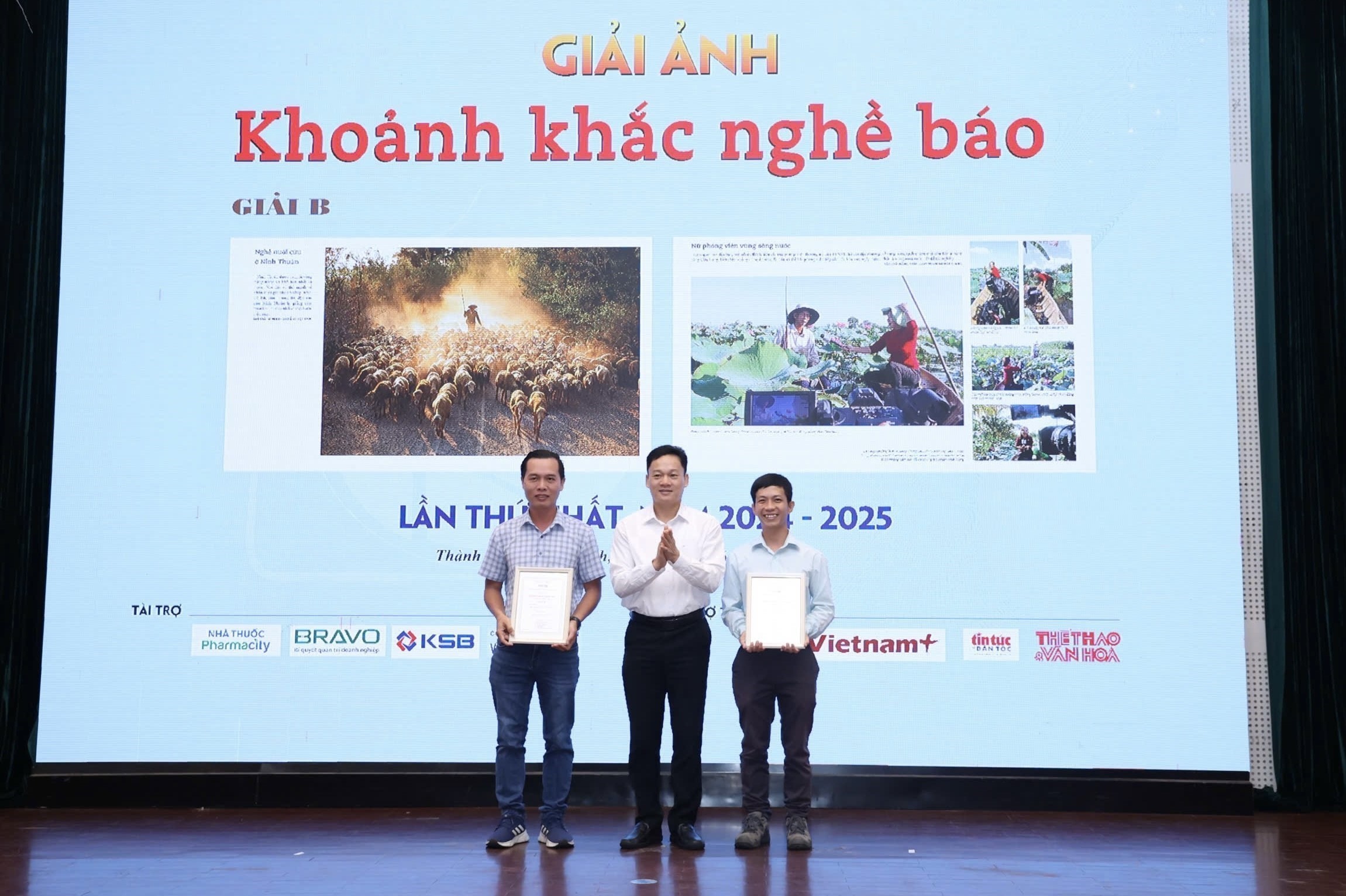 | Ban tổ chức trao giải B cho các tác giả Ngô Hồng Thái, Cơ quan thường trú tại tỉnh Hậu Giang và Lê Văn Minh, Phòng đại diện Báo ảnh Việt Nam tại thành phố Hồ Chí Minh, ngày 12/6 |