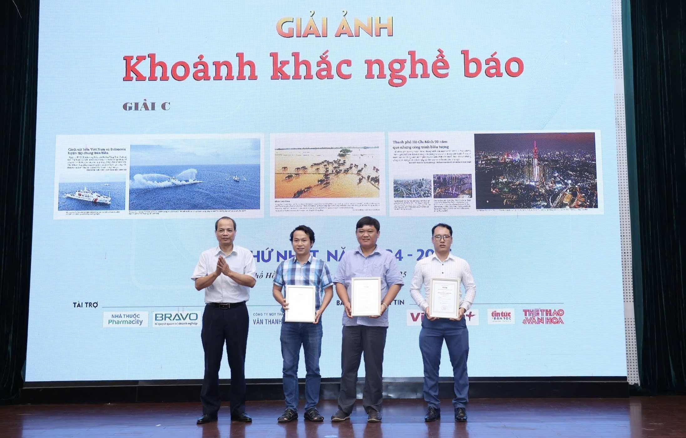 | Trưởng ban biên tập Ảnh TTXVN trao giải C cho các tác giả tại cuộc thi ảnh “Khoảnh khắc nghề báo”, ngày 12/6 |
