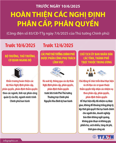 Tin cùng chuyên mục Cả nước có 34 đơn vị hành chính cấp tỉnh12/06/2025 09:28Hà Nội (TTXVN 12/6) Sáng 12/6/2025, tại kỳ họp thứ 9, Quốc hội khóa XV đã biểu quyết thông qua Nghị quyết về việc sắp xếp đơn vị hành chính cấp tỉnh năm 2025. Theo đó, kể từ ngày Nghị quyết có hiệu lực, ngày 12/6/2025, cả nước có 34 đơn vị hành... Quyết tâm hoàn thành cơ bản mục tiêu xóa nhà tạm, nhà dột nát trước 31/8/202512/06/2025 09:20Hà Nội (TTXVN 10/6) Thủ tướng Chính phủ Phạm Minh Chính yêu cầu các bộ ngành, địa phương quyết liệt hơn nữa, thần tốc hơn nữa, quyết tâm hoàn thành cơ bản mục tiêu xóa nhà tạm, nhà dột nát trên phạm vi cả nước trước ngày 31/8/2025; trong... Từ 9/6/2025, Hà Nội tiếp nhận 100% hồ sơ trực tuyến lĩnh vực xây dựng (Phần 3 và hết)09/06/2025 09:51Hà Nội (TTXVN 9/6) Từ ngày 9/6/2025, Trung tâm Phục vụ hành chính công thành phố Hà Nội chính thức tiếp nhận 100% hồ sơ trực tuyến và trực tuyến toàn trình đối với các thủ tục hành chính thuộc lĩnh vực hoạt động xây dựng. Việc triển khai... Từ 9/6/2025, Hà Nội tiếp nhận 100% hồ sơ trực tuyến lĩnh vực xây dựng (Phần 2)09/06/2025 09:50Hà Nội (TTXVN 9/6) Từ ngày 9/6/2025, Trung tâm Phục vụ hành chính công thành phố Hà Nội chính thức tiếp nhận 100% hồ sơ trực tuyến và trực tuyến toàn trình đối với các thủ tục hành chính thuộc lĩnh vực hoạt động xây dựng. Việc triển khai... Từ 9/6/2025, Hà Nội tiếp nhận 100% hồ sơ trực tuyến lĩnh vực xây dựng (Phần 1)09/06/2025 09:49Hà Nội (TTXVN 9/6) Từ ngày 9/6/2025, Trung tâm Phục vụ hành chính công thành phố Hà Nội chính thức tiếp nhận 100% hồ sơ trực tuyến và trực tuyến toàn trình đối với các thủ tục hành chính thuộc lĩnh vực hoạt động xây dựng. Việc triển khai... Trước ngày 10/6/2025, hoàn thiện các Nghị định phân cấp, phân quyền09/06/2025 09:47Hà Nội (TTXVN 8/6) Thủ tướng Chính phủ Phạm Minh Chính yêu cầu Bộ trưởng, Thủ trưởng cơ quan ngang Bộ khẩn trương hoàn thiện các dự thảo Nghị định phân cấp, phân quyền, phân định thẩm quyền theo các ngành, lĩnh vực phân công quản lý của Bộ, ngành...
