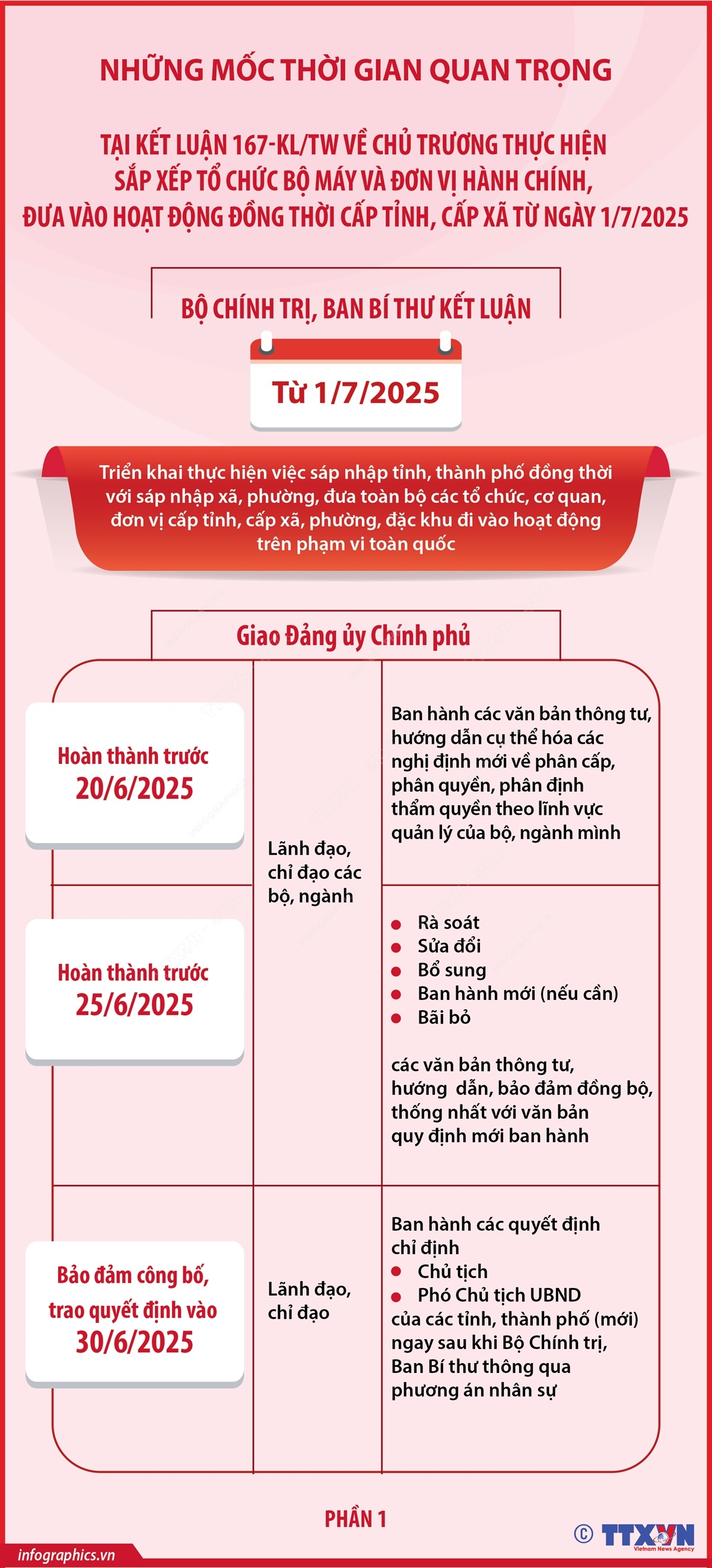 Phổ biến giáo dục Pháp luậtThông tin đồ họa Những mốc thời gian quan trọng tại Kết luận 167-KL/TW (phần 1) Thứ hai, 16/06/2025 09:56 Hà Nội (TTXVN 14/6) Thay mặt Bộ Chính trị, Ủy viên Bộ Chính trị, Thường trực Ban Bí thư Trần Cẩm Tú vừa ký ban hành Kết luận số 167-KL/TW (ngày 13/6/2025) của Bộ Chính trị, Ban Bí thư về chủ trương thực hiện sắp xếp tổ chức bộ máy và đơn vị hành chính, đưa vào hoạt động đồng thời cấp tỉnh, cấp xã từ ngày 1/7/2025 (gọi tắt là Kết luận số 167). Theo đó, Bộ Chính trị, Ban Bí thư kết luận: Quyết định triển khai thực hiện việc sáp nhập tỉnh, thành phố đồng thời với sáp nhập xã, phường, đưa toàn bộ các tổ chức, cơ quan, đơn vị cấp tỉnh, cấp xã, phường, đặc khu đi vào hoạt động trên phạm vi toàn quốc từ ngày 1/7/2025.