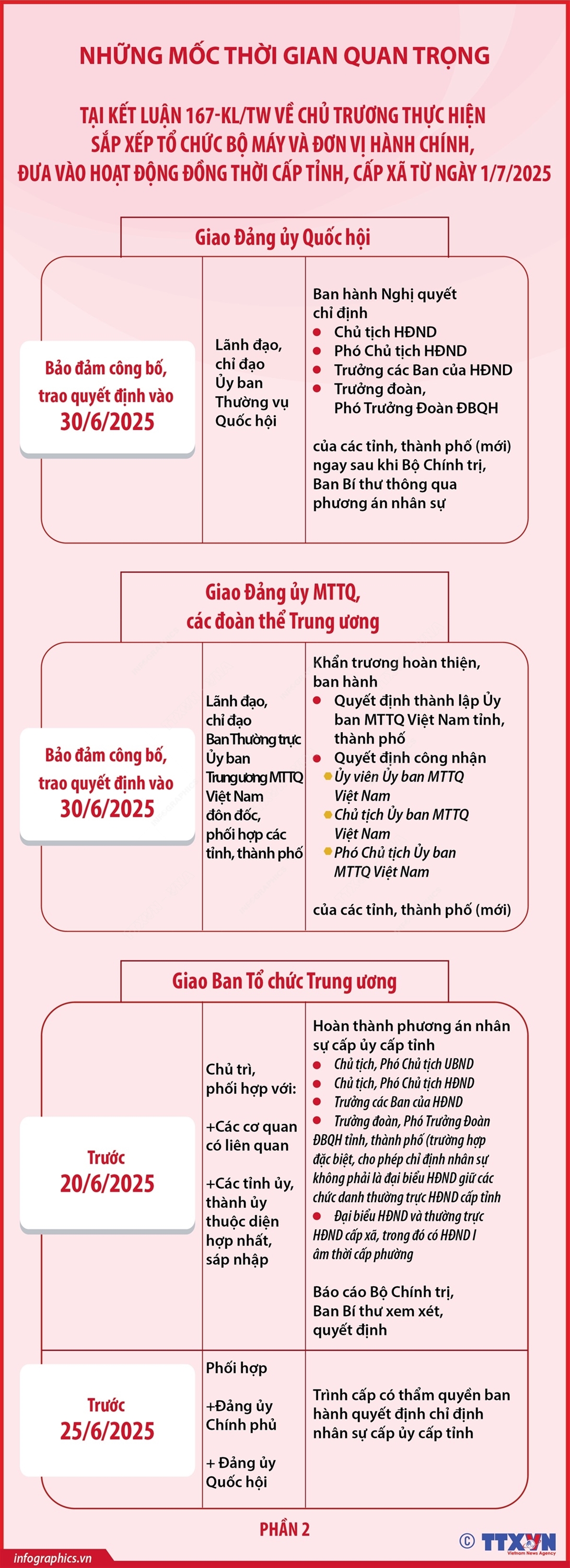Phổ biến giáo dục Pháp luậtThông tin đồ họa Những mốc thời gian quan trọng tại Kết luận 167-KL/TW (phần 2) Thứ hai, 16/06/2025 09:57 Hà Nội (TTXVN 14/6) Thay mặt Bộ Chính trị, Ủy viên Bộ Chính trị, Thường trực Ban Bí thư Trần Cẩm Tú vừa ký ban hành Kết luận số 167-KL/TW (ngày 13/6/2025) của Bộ Chính trị, Ban Bí thư về chủ trương thực hiện sắp xếp tổ chức bộ máy và đơn vị hành chính, đưa vào hoạt động đồng thời cấp tỉnh, cấp xã từ ngày 1/7/2025 (gọi tắt là Kết luận số 167). Theo đó, Bộ Chính trị, Ban Bí thư kết luận: Quyết định triển khai thực hiện việc sáp nhập tỉnh, thành phố đồng thời với sáp nhập xã, phường, đưa toàn bộ các tổ chức, cơ quan, đơn vị cấp tỉnh, cấp xã, phường, đặc khu đi vào hoạt động trên phạm vi toàn quốc từ ngày 1/7/2025.