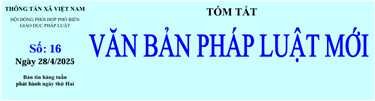Tin cùng chuyên mục Tóm tắt Văn bản pháp luật mới: số 22 ngày 09/6/2025 của Hội đồng phối hợp Phổ biến giáo dục pháp luật TTXVN10/06/2025 10:15 Tóm tắt Văn bản pháp luật mới: số 21 ngày 02/6/2025 của Hội đồng phối hợp Phổ biến giáo dục pháp luật TTXVN04/06/2025 09:30 Tóm tắt Văn bản pháp luật mới: số 20 ngày 26/5/2025 của Hội đồng phối hợp Phổ biến giáo dục pháp luật TTXVN26/05/2025 14:53 Tóm tắt Văn bản pháp luật mới: số 18 ngày 12/5/2025 của Hội đồng phối hợp Phổ biến giáo dục pháp luật TTXVN13/05/2025 10:06 Tóm tắt Văn bản pháp luật mới: số 17 ngày 05/5/2025 của Hội đồng phối hợp Phổ biến giáo dục pháp luật TTXVN05/05/2025 14:47 Tóm tắt Văn bản pháp luật mới: số 16 ngày 28/4/2025 của Hội đồng phối hợp Phổ biến giáo dục pháp luật TTXVN29/04/2025 09:54