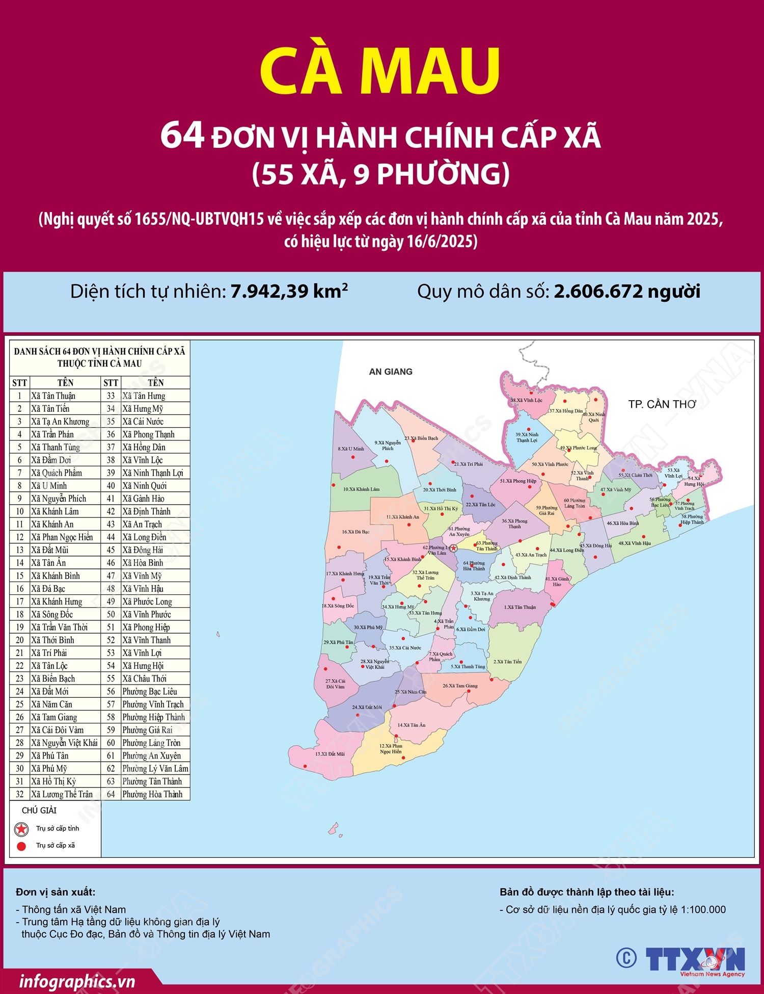 Phổ biến giáo dục Pháp luậtThông tin đồ họa 64 đơn vị hành chính cấp xã của tỉnh Cà Mau năm 2025 Thứ năm, 19/06/2025 10:38 Hà Nội (TTXVN 16/6) Ngày 16/6/2025, thay mặt Ủy ban Thường vụ Quốc hội, Chủ tịch Quốc hội Trần Thanh Mẫn ký Nghị quyết số 1655/NQ-UBTVQH15 về việc sắp xếp các đơn vị hành chính cấp xã của tỉnh Cà Mau năm 2025. Nghị quyết có hiệu lực từ 16/6/2025. Theo đó, sau khi sắp xếp, tỉnh Cà Mau có 64 đơn vị hành chính cấp xã, gồm 55 xã và 09 phường; trong đó có 54 xã, 09 phường hình thành sau sắp xếp quy định tại Điều này và 01 xã không thực hiện sắp xếp là xã Hồ Thị Kỷ.