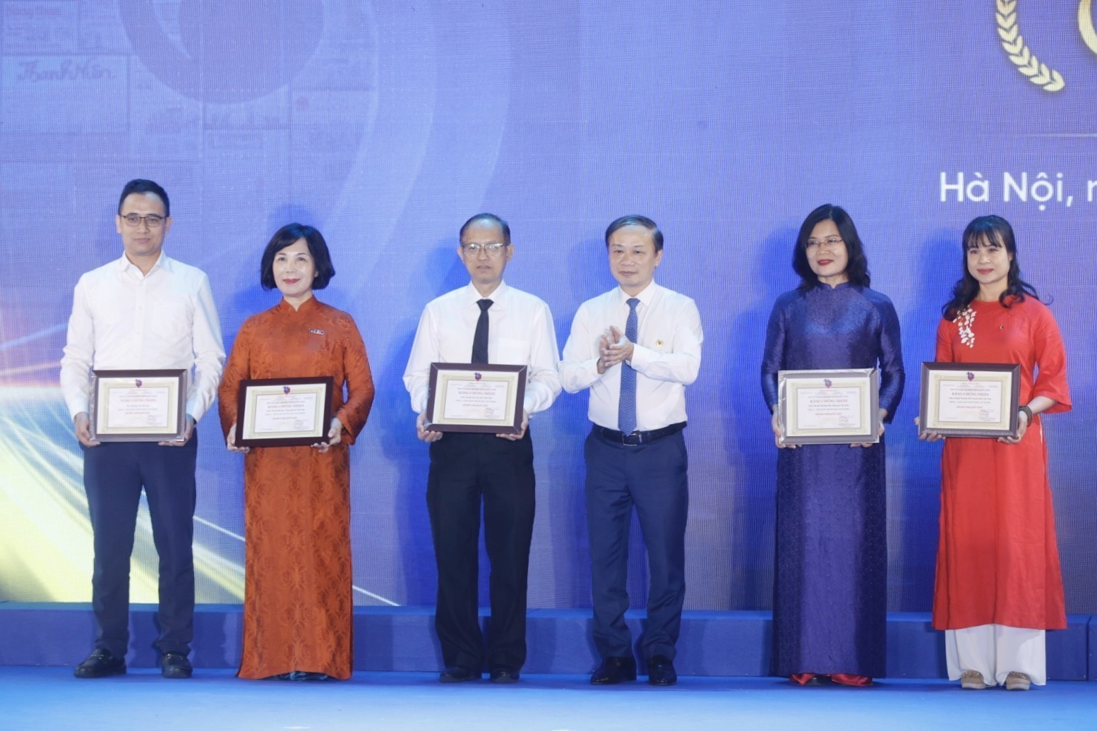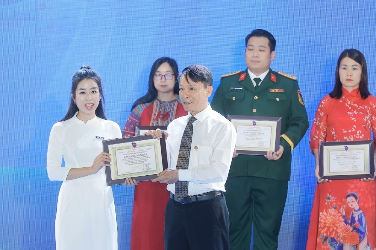 | Nhà báo Nguyễn Hồng Hạnh (thứ hai bên trái) thay mặt Liên chi hội Nhà báo TTXVN nhận giải A Gian trưng bày ấn tượng tại Hội Báo toàn quốc 2025 |