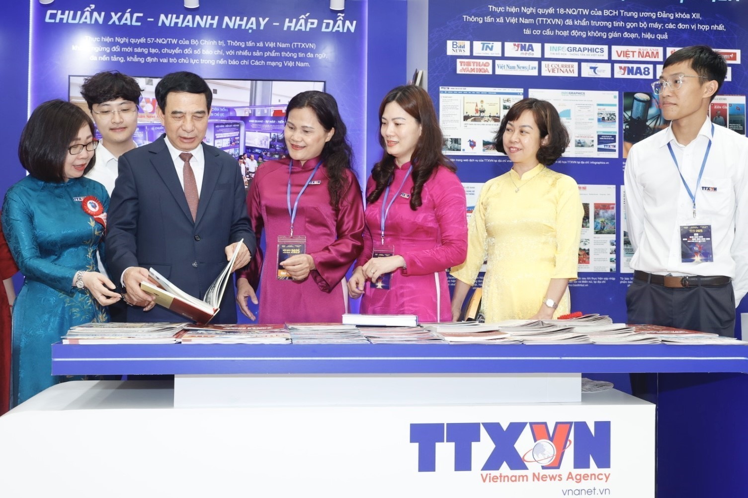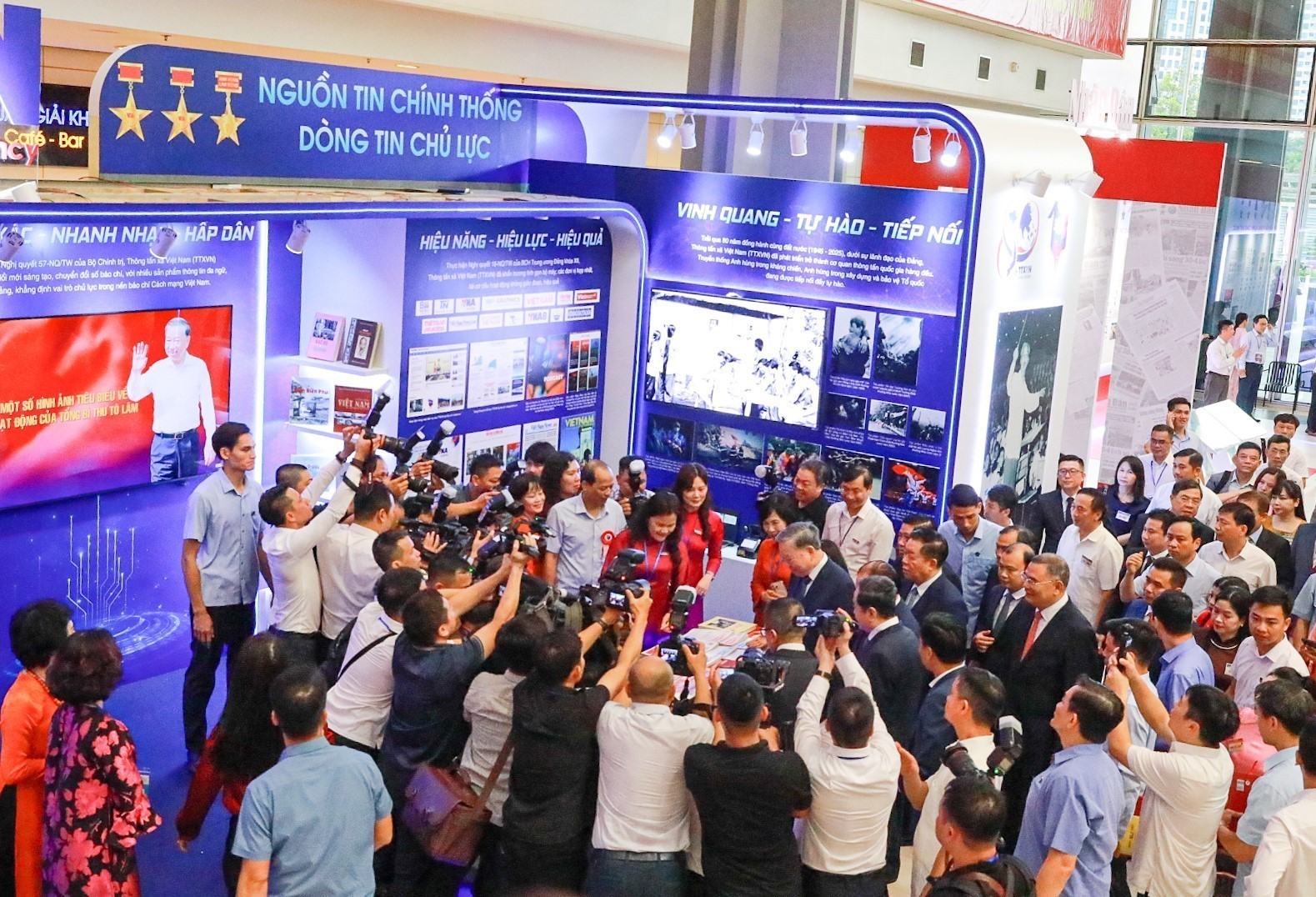 Đặc biệt, tại Hội Báo toàn quốc năm 2025, gian trưng bày của TTXVN đã vinh dự được đón tiếp các đồng chí lãnh đạo cao nhất của Đảng và Nhà nước đến tham quan, động viên những người làm báo Thông tấn.