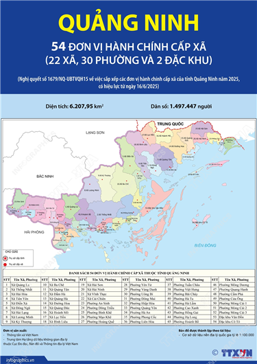 Phổ biến giáo dục Pháp luậtThông tin đồ họa 99 đơn vị hành chính cấp xã của tỉnh Bắc Ninh năm 2025 Thứ hai, 23/06/2025 14:52 Hà Nội (TTXVN 19/6) Ngày 16/6/2025, thay mặt Ủy ban Thường vụ Quốc hội, Chủ tịch Quốc hội Trần Thanh Mẫn ký Nghị quyết số 1658/NQ-UBTVQH15 về việc sắp xếp các đơn vị hành chính cấp xã của tỉnh Bắc Ninh năm 2025. Nghị quyết có hiệu lực từ 16/6/2025. Theo đó, sau khi sắp xếp, tỉnh Bắc Ninh có 99 đơn vị hành chính cấp xã, gồm 66 xã và 33 phường; trong đó có 65 xã, 33 phường hình thành sau sắp xếp quy định tại Điều này và 01 xã không thực hiện sắp xếp là xã Tuấn Đạo.