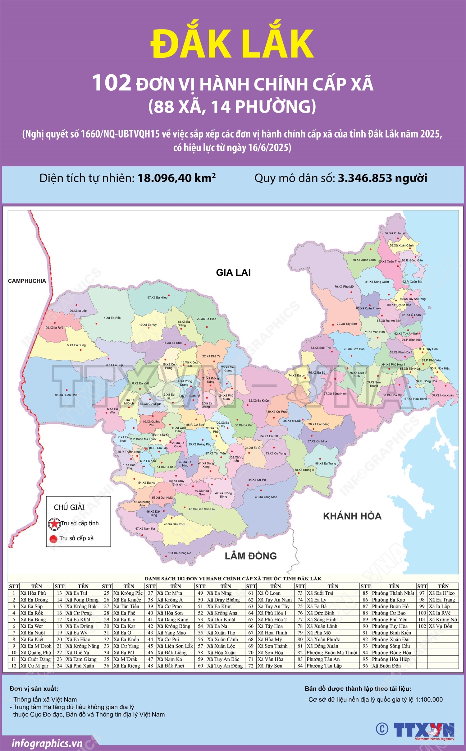 Phổ biến giáo dục Pháp luậtThông tin đồ họa 102 đơn vị hành chính cấp xã của tỉnh Đắk Lắk năm 2025 Thứ hai, 23/06/2025 15:03 Hà Nội (TTXVN 20/6) Ngày 16/6/2025, thay mặt Ủy ban Thường vụ Quốc hội, Chủ tịch Quốc hội Trần Thanh Mẫn ký Nghị quyết số 1660/NQ-UBTVQH15 về việc sắp xếp các đơn vị hành chính cấp xã của tỉnh Đắk Lắk năm 2025. Nghị quyết có hiệu lực từ 16/6/2025. Theo đó, sau khi sắp xếp, tỉnh Đắk Lắk có 102 đơn vị hành chính cấp xã, gồm 88 xã và 14 phường; trong đó có 82 xã, 14 phường hình thành sau sắp xếp, thực hiện đổi tên quy định tại Điều này và 06 xã không thực hiện sắp xếp là các xã Ea H’Leo, Ea Trang, Ia Lốp, Ia Rvê, Krông Nô, Vụ Bổn.