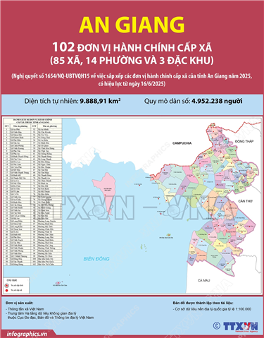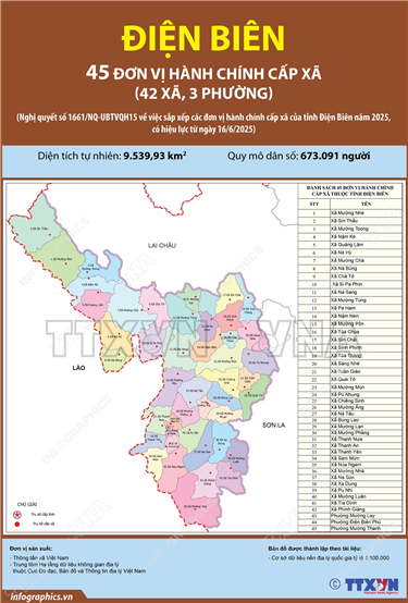 Tin cùng chuyên mục Thông tin chi tiết sắp xếp các đơn vị hành chính cấp xã của thành phố Huế23/06/2025 15:06Hà Nội (TTXVN 20/6) Theo Nghị quyết số 1675/NQ-UBTVQH15 ngày 16/6/2025 của Ủy ban Thường vụ Quốc hội, sau khi sắp xếp, thành phố Huế có 40 đơn vị hành chính cấp xã, gồm 21 phường và 19 xã; trong đó có 20 phường, 19 xã hình thành sau sắp xếp... Thông tin chi tiết về 75 xã ở Hà Nội23/06/2025 15:05Hà Nội (TTXVN 20/6) Theo Nghị quyết số 1656/NQ-UBTVQH15 ngày 16/6/2025 của Ủy ban Thường vụ Quốc hội, sau khi sắp xếp, thành phố Hà Nội có 126 đơn vị hành chính cấp xã, gồm 51 phường và 75 xã. Thông tin chi tiết về 51 phường ở Hà Nội23/06/2025 15:04Hà Nội (TTXVN 20/6) Theo Nghị quyết số 1656/NQ-UBTVQH15 ngày 16/6/2025 của Ủy ban Thường vụ Quốc hội, sau khi sắp xếp, thành phố Hà Nội có 126 đơn vị hành chính cấp xã, gồm 51 phường và 75 xã. 102 đơn vị hành chính cấp xã của tỉnh Đắk Lắk năm 202523/06/2025 15:03Hà Nội (TTXVN 20/6) Ngày 16/6/2025, thay mặt Ủy ban Thường vụ Quốc hội, Chủ tịch Quốc hội Trần Thanh Mẫn ký Nghị quyết số 1660/NQ-UBTVQH15 về việc sắp xếp các đơn vị hành chính cấp xã của tỉnh Đắk Lắk năm 2025. Nghị quyết có hiệu lực từ 16/6/2025. Theo đó, sau khi sắp xếp,... 45 đơn vị hành chính cấp xã của tỉnh Điện Biên năm 202523/06/2025 15:03Hà Nội (TTXVN 20/6) Ngày 16/6/2025, thay mặt Ủy ban Thường vụ Quốc hội, Chủ tịch Quốc hội Trần Thanh Mẫn ký Nghị quyết số 1661/NQ-UBTVQH15 về việc sắp xếp các đơn vị hành chính cấp xã của tỉnh Điện Biên năm 2025. Nghị quyết có hiệu lực từ 16/6/2025. Theo đó, sau khi sắp... 102 đơn vị hành chính cấp xã của tỉnh An Giang năm 202523/06/2025 15:02Hà Nội (TTXVN 20/6) Ngày 16/6/2025, thay mặt Ủy ban Thường vụ Quốc hội, Chủ tịch Quốc hội Trần Thanh Mẫn ký Nghị quyết số 1654/NQ-UBTVQH15 về việc sắp xếp các đơn vị hành chính cấp xã của tỉnh An Giang năm 2025. Nghị quyết có hiệu lực từ 16/6/2025. Theo đó, sau khi sắp xếp,...