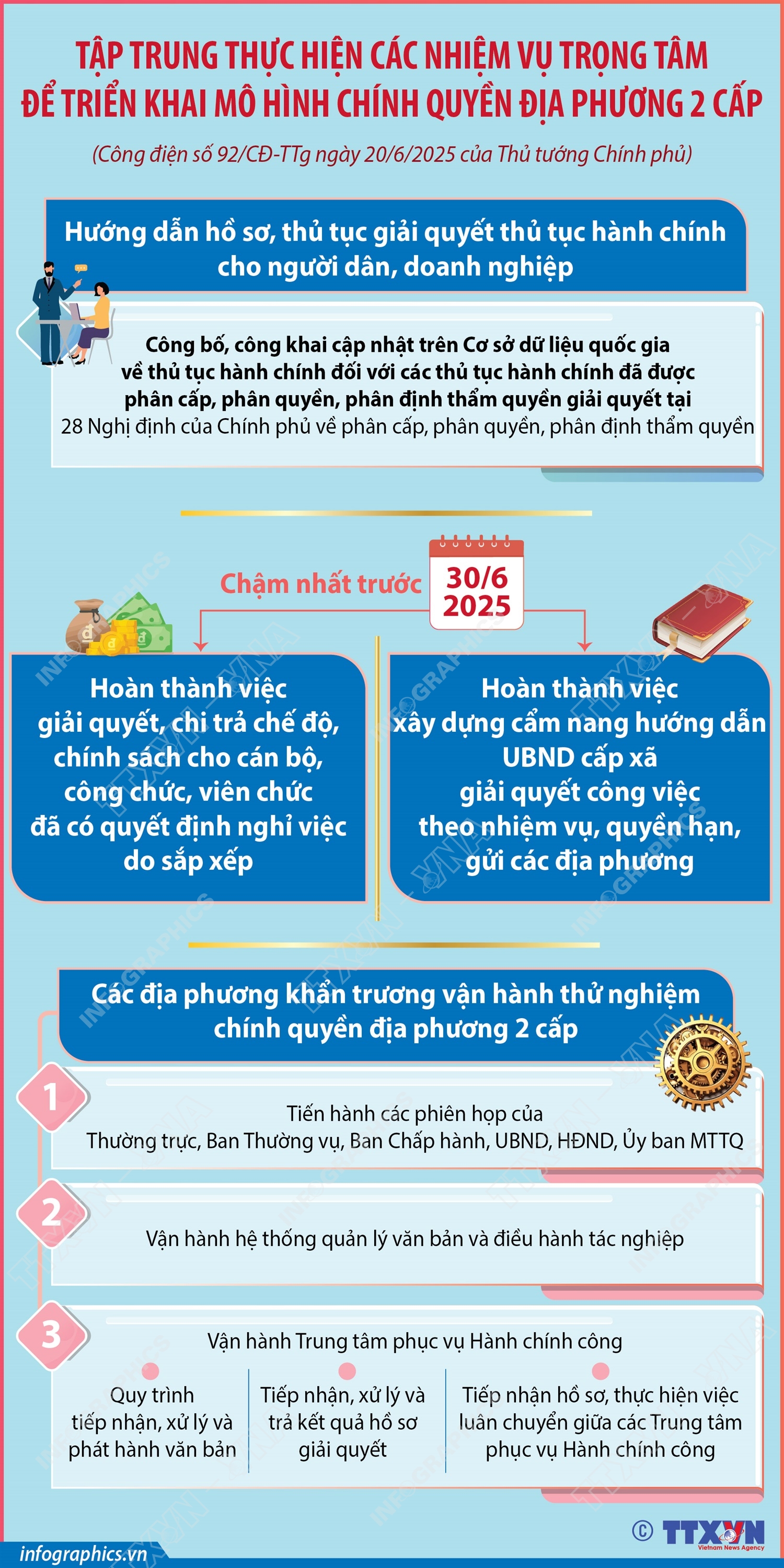 Phổ biến giáo dục Pháp luậtThông tin đồ họa Tập trung thực hiện các nhiệm vụ trọng tâm để triển khai mô hình chính quyền địa phương 2 cấp Thứ hai, 23/06/2025 15:07 Hà Nội (TTXVN 21/6) Thủ tướng Chính phủ Phạm Minh Chính đã ký Công điện số 92/CĐ-TTg ngày 20/6/2025 yêu cầu các bộ ngành, địa phương tập trung thực hiện các nhiệm vụ trọng tâm để triển khai mô hình chính quyền địa phương 2 cấp từ ngày 1/7/2025. Để triển khai có hiệu quả mô hình chính quyền địa phương 02 cấp từ ngày 01/7/2025 theo chỉ đạo của Bộ Chính trị, Ban Bí thư và đồng chí Tổng Bí thư Tô Lâm, Thủ tướng Chính phủ yêu cầu Bộ trưởng, Thủ trưởng cơ quan ngang Bộ, Chủ tịch Ủy ban nhân các tỉnh, thành phố trực thuộc trung ương tập trung thực hiện các nhiệm vụ trọng tâm: Hướng dẫn hồ sơ, thủ tục giải quyết thủ tục hành chính cho người dân, doanh nghiệp; hoàn thành việc giải quyết, chi trả chế độ, chính sách cho cán bộ, công chức, viên chức đã có quyết định nghỉ việc do sắp xếp và hoàn thành việc xây dựng cẩm nang hướng dẫn UBND cấp xã giải quyết công việc theo nhiệm vụ, quyền hạn, gửi các địa phương chậm nhất trước 30/6/2025 và các địa phương khẩn trương vận hành thử nghiệm chính quyền địa phương 2 cấp.