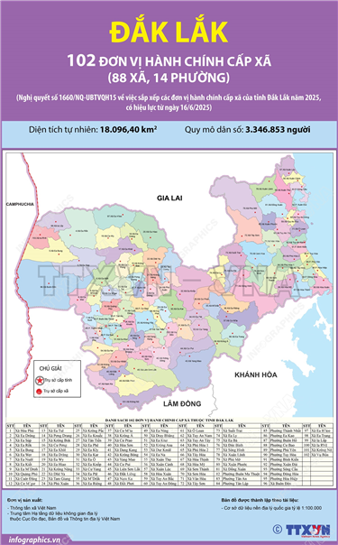 Tin cùng chuyên mục 95 đơn vị hành chính cấp xã của tỉnh Đồng Nai năm 202523/06/2025 15:0895 đơn vị hành chính cấp xã của tỉnh Đồng Nai năm 2025 Hà Nội (TTXVN 21/6) Ngày 16/6/2025, thay mặt Ủy ban Thường vụ Quốc hội, Chủ tịch Quốc hội Trần Thanh Mẫn ký Nghị quyết số 1662/NQ-UBTVQH15 về việc sắp xếp các đơn vị hành chính cấp xã của tỉnh Đồng Nai năm 2025. Nghị quyết... Tập trung thực hiện các nhiệm vụ trọng tâm để triển khai mô hình chính quyền địa phương 2 cấp23/06/2025 15:07Hà Nội (TTXVN 21/6) Thủ tướng Chính phủ Phạm Minh Chính đã ký Công điện số 92/CĐ-TTg ngày 20/6/2025 yêu cầu các bộ ngành, địa phương tập trung thực hiện các nhiệm vụ trọng tâm để triển khai mô hình chính quyền địa phương 2 cấp từ ngày... Thông tin chi tiết sắp xếp các đơn vị hành chính cấp xã của thành phố Huế23/06/2025 15:06Hà Nội (TTXVN 20/6) Theo Nghị quyết số 1675/NQ-UBTVQH15 ngày 16/6/2025 của Ủy ban Thường vụ Quốc hội, sau khi sắp xếp, thành phố Huế có 40 đơn vị hành chính cấp xã, gồm 21 phường và 19 xã; trong đó có 20 phường, 19 xã hình thành sau sắp xếp... Thông tin chi tiết về 75 xã ở Hà Nội23/06/2025 15:05Hà Nội (TTXVN 20/6) Theo Nghị quyết số 1656/NQ-UBTVQH15 ngày 16/6/2025 của Ủy ban Thường vụ Quốc hội, sau khi sắp xếp, thành phố Hà Nội có 126 đơn vị hành chính cấp xã, gồm 51 phường và 75 xã. Thông tin chi tiết về 51 phường ở Hà Nội23/06/2025 15:04Hà Nội (TTXVN 20/6) Theo Nghị quyết số 1656/NQ-UBTVQH15 ngày 16/6/2025 của Ủy ban Thường vụ Quốc hội, sau khi sắp xếp, thành phố Hà Nội có 126 đơn vị hành chính cấp xã, gồm 51 phường và 75 xã. 102 đơn vị hành chính cấp xã của tỉnh Đắk Lắk năm 202523/06/2025 15:03Hà Nội (TTXVN 20/6) Ngày 16/6/2025, thay mặt Ủy ban Thường vụ Quốc hội, Chủ tịch Quốc hội Trần Thanh Mẫn ký Nghị quyết số 1660/NQ-UBTVQH15 về việc sắp xếp các đơn vị hành chính cấp xã của tỉnh Đắk Lắk năm 2025. Nghị quyết có hiệu lực từ 16/6/2025. Theo đó, sau khi sắp xếp,...