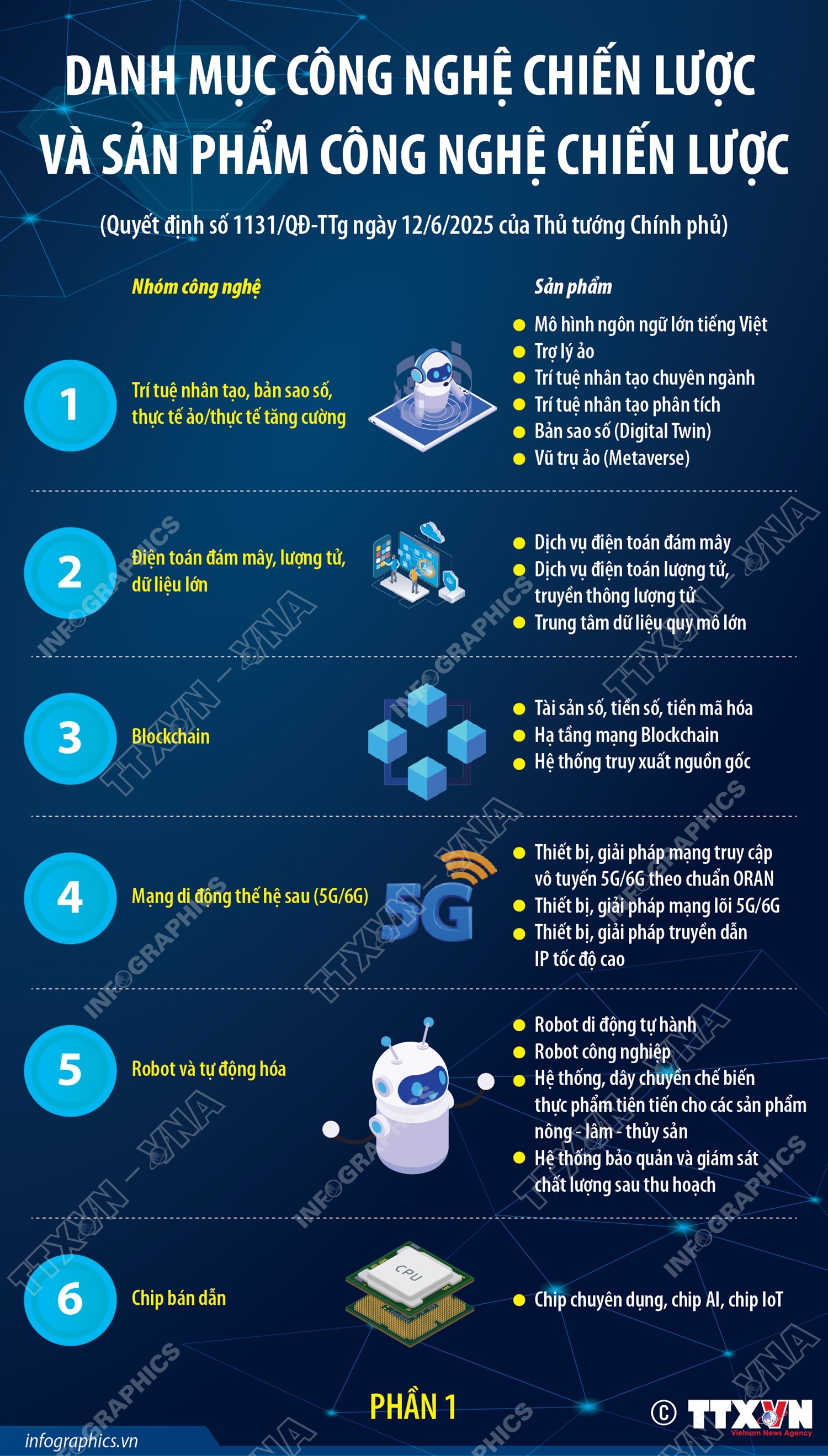 Phổ biến giáo dục Pháp luậtThông tin đồ họa 11 nhóm công nghệ chiến lược và 35 nhóm sản phẩm công nghệ chiến lược (phần 1) Thứ hai, 23/06/2025 15:13 Hà Nội (TTXVN 23/6) Tại Quyết định số 1131/QĐ-TTg ngày 12/6/2025, Thủ tướng đã ban hành danh mục gồm 11 nhóm công nghệ chiến lược và 35 nhóm sản phẩm công nghệ chiến lược. Nhóm công nghệ trí tuệ nhân tạo, bản sao số, thực tế ảo/thực tế tăng cường được xếp ở vị trí đầu tiên trong Danh mục, tiếp theo là các nhóm công nghệ: Điện toán đám mây, lượng tử, dữ liệu lớn; Blockchain; Mạng di động thế hệ sau (5G/6G); Robot và tự động hóa; Chip bán dẫn…