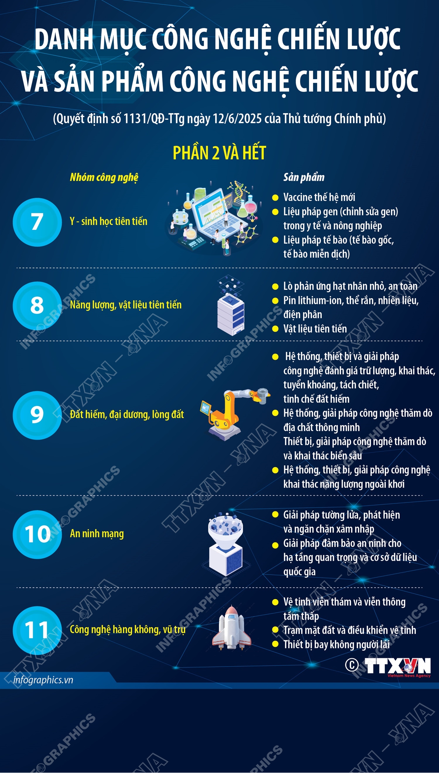 Phổ biến giáo dục Pháp luậtThông tin đồ họa 11 nhóm công nghệ chiến lược và 35 nhóm sản phẩm công nghệ chiến lược (phần 2 và hết) Thứ hai, 23/06/2025 15:14 Hà Nội (TTXVN 23/6) Tại Quyết định số 1131/QĐ-TTg ngày 12/6/2025, Thủ tướng đã ban hành danh mục gồm 11 nhóm công nghệ chiến lược và 35 nhóm sản phẩm công nghệ chiến lược. Nhóm công nghệ trí tuệ nhân tạo, bản sao số, thực tế ảo/thực tế tăng cường được xếp ở vị trí đầu tiên trong Danh mục, tiếp theo là các nhóm công nghệ: Điện toán đám mây, lượng tử, dữ liệu lớn; Blockchain; Mạng di động thế hệ sau (5G/6G); Robot và tự động hóa; Chip bán dẫn…