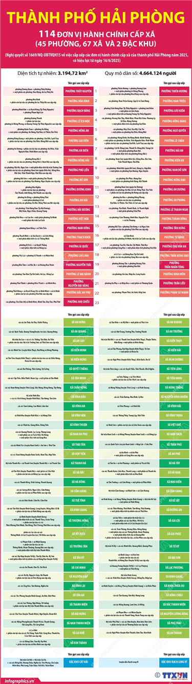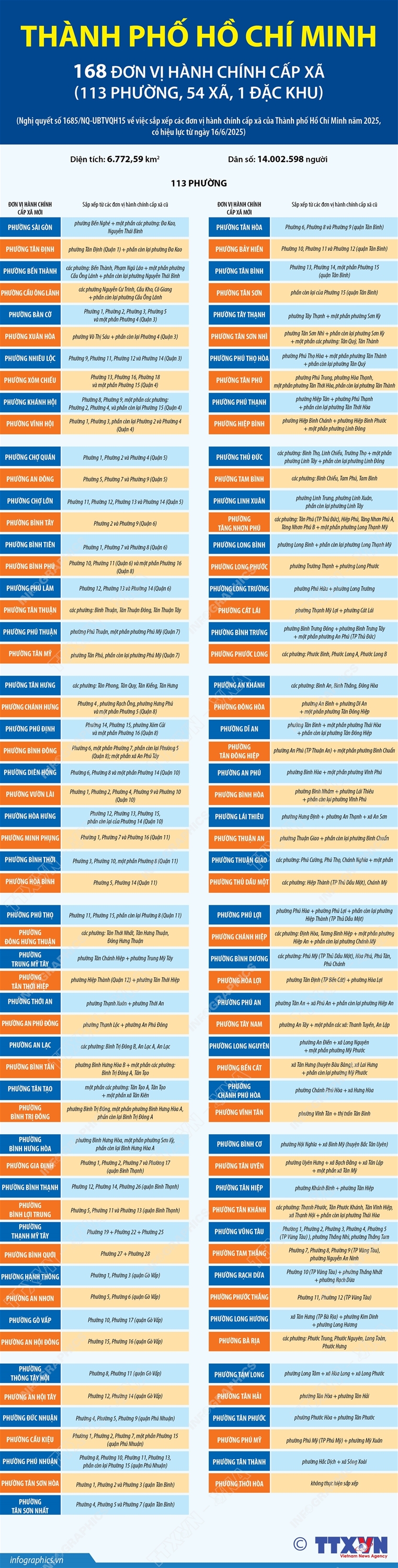 Phổ biến giáo dục Pháp luậtThông tin đồ họa Thông tin chi tiết về 113 phường của thành phố Hồ Chí Minh Thứ năm, 26/06/2025 11:05 Hà Nội (TTXVN 25/6) Theo Nghị quyết số 1685/NQ-UBTVQH15 ngày 16/6/2025 của Ủy ban Thường vụ Quốc hội, sau khi sắp xếp, Thành phố Hồ Chí Minh có 168 đơn vị hành chính cấp xã, gồm 113 phường, 54 xã và 01 đặc khu; trong đó có 112 phường, 50 xã, 01 đặc khu hình thành sau sắp xếp quy định tại Điều này và 05 đơn vị hành chính cấp xã không thực hiện sắp xếp là phường Thới Hòa, các xã Long Sơn, Hòa Hiệp, Bình Châu, Thạnh An.