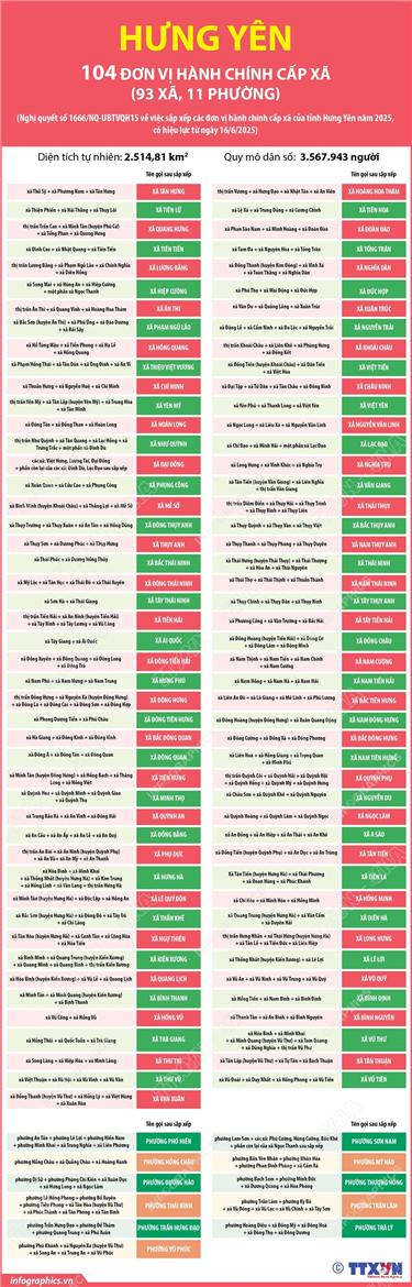 Tin cùng chuyên mục Hà Nội: Quy hoạch chi tiết Dự án mở rộng Quảng trường Ba Đình26/06/2025 11:04Hà Nội (TTXVN 23/6) Thủ tướng Chính phủ đã ký Quyết định số 1086/QĐ-TTg ngày 6/6/2025 phê duyệt nội dung quy hoạch chi tiết Dự án mở rộng Quảng trường Ba Đình. Theo quy hoạch, khu đất để mở rộng quảng trường ở vị trí: Phía Bắc giáp khu vực các ô cỏ Quảng... Lịch thi tốt nghiệp THPT năm 2025 đối với các thí sinh dự thi đề thi của chương trình GDPT hiện hành26/06/2025 11:03Hà Nội (TTXVN 25/6) Kỳ thi tốt nghiệp THPT năm 2025 diễn ra trong hai ngày 26 và 27/6/2025, với hai lịch thi dành cho thí sinh học theo Chương trình Giáo dục phổ thông hiện hành 2018 và thí sinh học theo Chương trình Giáo dục phổ thông 2006. Lịch thi tốt nghiệp THPT năm 2025 đối với các thí sinh dự thi đề thi của chương trình GDPT 200625/06/2025 11:02Hà Nội (TTXVN 25/6) Kỳ thi tốt nghiệp THPT năm 2025 diễn ra trong hai ngày 26 và 27/6/2025, với hai lịch thi dành cho thí sinh học theo Chương trình Giáo dục phổ thông hiện hành 2018 và thí sinh học theo Chương trình Giáo dục phổ thông 2006. Hà Nội: Quy hoạch chi tiết Dự án mở rộng Quảng trường Ba Đình25/06/2025 11:01Hà Nội (TTXVN 23/6) Thủ tướng Chính phủ đã ký Quyết định số 1086/QĐ-TTg ngày 6/6/2025 phê duyệt nội dung quy hoạch chi tiết Dự án mở rộng Quảng trường Ba Đình. Theo quy hoạch, khu đất để mở rộng quảng trường ở vị trí: Phía Bắc giáp khu vực các ô cỏ Quảng... Thông tin chi tiết sắp xếp các đơn vị hành chính cấp xã của tỉnh Hưng Yên25/06/2025 11:00Hà Nội (TTXVN 24/6) Theo Nghị quyết số 1666/NQ-UBTVQH15 ngày 16/6/2025 của Ủy ban Thường vụ Quốc hội, sau khi sắp xếp, tỉnh Hưng Yên có 104 đơn vị hành chính cấp xã, gồm 93 xã và 11 phường. Thông tin chi tiết sắp xếp các đơn vị hành chính cấp xã của thành phố Hải Phòng25/06/2025 10:59Hà Nội (TTXVN 24/6) Theo Nghị quyết số 1669/NQ-UBTVQH15 ngày 16/6/2025 của Ủy ban Thường vụ Quốc hội, sau khi sắp xếp, thành phố Hải Phòng có 114 đơn vị hành chính cấp xã, gồm 45 phường, 67 xã và 2 đặc khu.