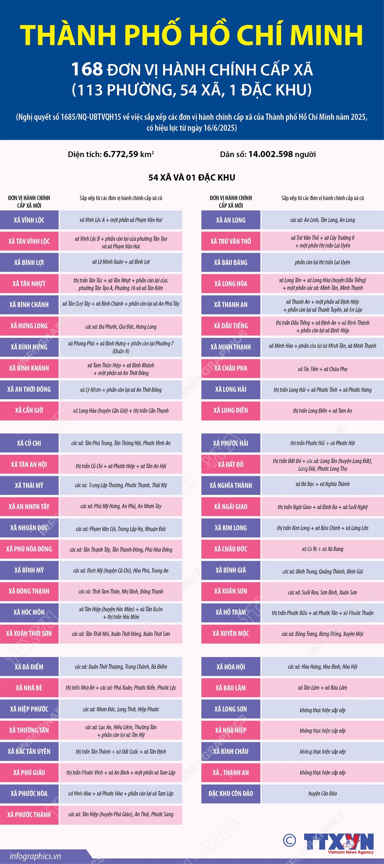 Phổ biến giáo dục Pháp luậtThông tin đồ họa Thông tin chi tiết về 54 xã và 1 đặc khu của thành phố Hồ Chí Minh Thứ năm, 26/06/2025 11:06 Hà Nội (TTXVN 25/6) Theo Nghị quyết số 1685/NQ-UBTVQH15 ngày 16/6/2025 của Ủy ban Thường vụ Quốc hội, sau khi sắp xếp, Thành phố Hồ Chí Minh có 168 đơn vị hành chính cấp xã, gồm 113 phường, 54 xã và 01 đặc khu; trong đó có 112 phường, 50 xã, 01 đặc khu hình thành sau sắp xếp quy định tại Điều này và 05 đơn vị hành chính cấp xã không thực hiện sắp xếp là phường Thới Hòa, các xã Long Sơn, Hòa Hiệp, Bình Châu, Thạnh An.