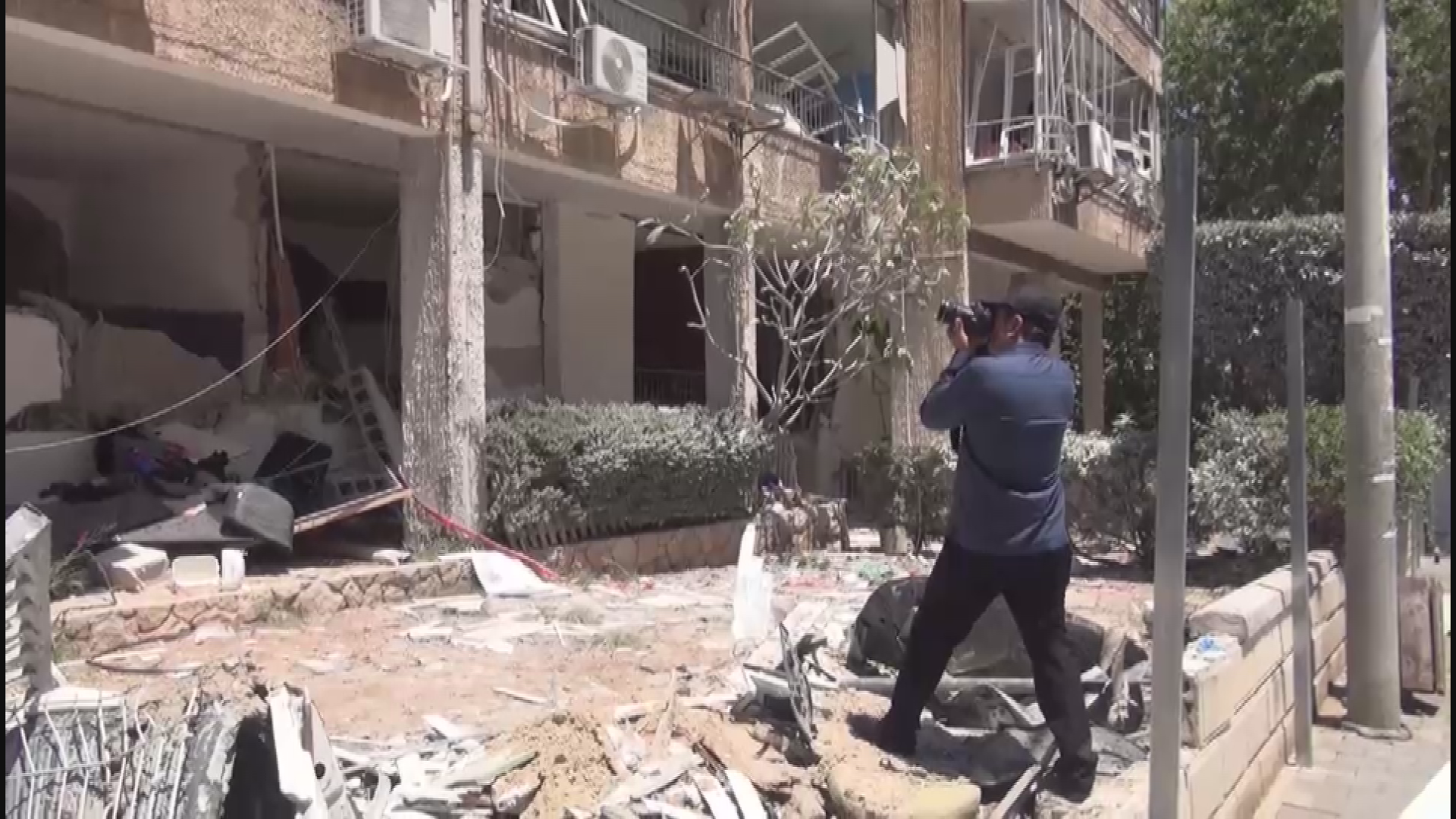 | Trưởng CQTT TTXVN tại Tel Aviv Trần Thanh Bình ghi lại hình ảnh tòa nhà đổ nát tại thành phố Tel Aviv sau các đòn tấn công trả đũa mạnh mẽ của Iran, tháng 6/2025 |