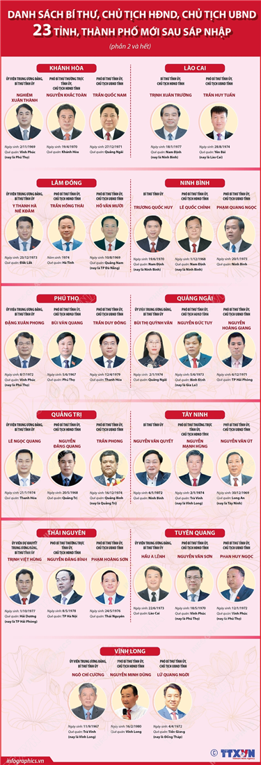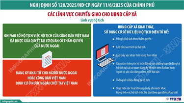 Tin cùng chuyên mục Thông tin chi tiết sắp xếp các đơn vị hành chính cấp xã của tỉnh Hà Tĩnh30/06/2025 13:57Hà Nội (TTXVN 27/6) Theo Nghị quyết số 1665/NQ-UBTVQH15 ngày 16/6/2025 của Ủy ban Thường vụ Quốc hội, sau khi sắp xếp, tỉnh Hà Tĩnh có 69 đơn vị hành chính cấp xã, gồm 60 xã và 9 phường. Thông tin chi tiết sắp xếp các đơn vị hành chính cấp xã của tỉnh Cà Mau30/06/2025 13:56Hà Nội (TTXVN 27/6) Theo Nghị quyết số 1655/NQ-UBTVQH15 ngày 16/6/2025 của Ủy ban Thường vụ Quốc hội, sau khi sắp xếp, tỉnh Cà Mau có 64 đơn vị hành chính cấp xã, gồm 55 xã và 09 phường; trong đó có 54 xã, 09 phường hình thành sau sắp xếp... Một số nhiệm vụ trong lĩnh vực hộ tịch chuyển từ thẩm quyền của UBND cấp tỉnh sang thẩm quyền của Chủ tịch UBND cấp tỉnh30/06/2025 13:55Hà Nội (TTXVN 27/6) Theo Nghị định số 120/2025/NĐ-CP ngày 11/6/2025 quy định về phân định thẩm quyền của chính quyền địa phương 02 cấp trong lĩnh vực quản lý nhà nước của Bộ Tư pháp, từ 1/7/2025, một số nhiệm vụ trong lĩnh vực hộ tịch chuyển từ thẩm quyền của UBND cấp tỉnh sang thẩm quyền của Chủ... Từ 1/7/2025: Chuyển giao lĩnh vực con nuôi và chứng thực cho UBND cấp xã30/06/2025 13:54Hà Nội (TTXVN 27/6) Theo Nghị định số 120/2025/NĐ-CP ngày 11/6/2025 quy định về phân định thẩm quyền của chính quyền địa phương 02 cấp trong lĩnh vực quản lý nhà nước của Bộ Tư pháp, từ 1/7/2025, UBND cấp xã thực hiện việc xác nhận công dân Việt Nam thường trú ở khu... Từ 1/7/2025: Chuyển giao lĩnh vực hộ tịch cho UBND cấp xã (phần 3 và hết)30/06/2025 13:53Hà Nội (TTXVN 27/6) Theo Nghị định số 120/2025/NĐ-CP ngày 11/6/2025 quy định về phân định thẩm quyền của chính quyền địa phương 02 cấp trong lĩnh vực quản lý nhà nước của Bộ Tư pháp, từ 1/7/2025, lĩnh vực hộ tịch (đăng ký khai sinh; đăng ký kết hôn; đăng ký giám... Danh sách Bí thư, Chủ tịch HĐND, Chủ tịch UBND 23 tỉnh, thành mới sau sáp nhập (phần 2 và hết)30/06/2025 10:09Hà Nội (TTXVN 30/6) Sáng 30/6/2025, Lễ công bố các nghị quyết, quyết định của Trung ương và địa phương về sáp nhập đơn vị hành chính, thành lập tổ chức đảng, chỉ định cấp uỷ, Hội đồng nhân dân, Ủy ban nhân dân, Ủy ban Mặt trận Tổ quốc Việt Nam tỉnh,...