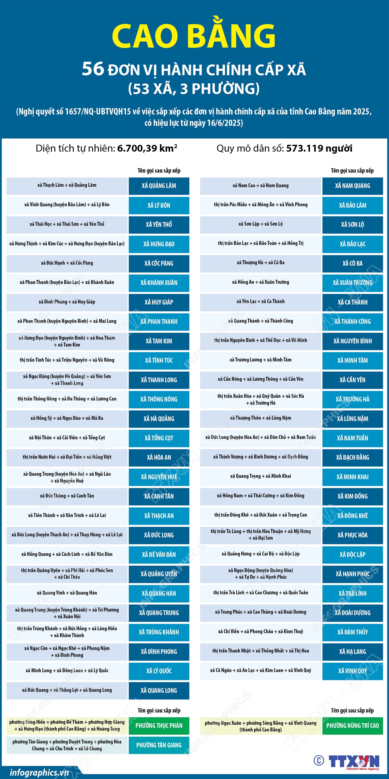 Phổ biến giáo dục Pháp luậtThông tin đồ họa Thông tin chi tiết sắp xếp các đơn vị hành chính cấp xã của tỉnh Cao Bằng Thứ hai, 30/06/2025 13:58 Hà Nội (TTXVN 27/6) Theo Nghị quyết số 1657/NQ-UBTVQH15 ngày 16/6/2025 của Ủy ban Thường vụ Quốc hội, sau khi sắp xếp, tỉnh Cao Bằng có 56 đơn vị hành chính cấp xã, gồm 53 xã và 03 phường.
