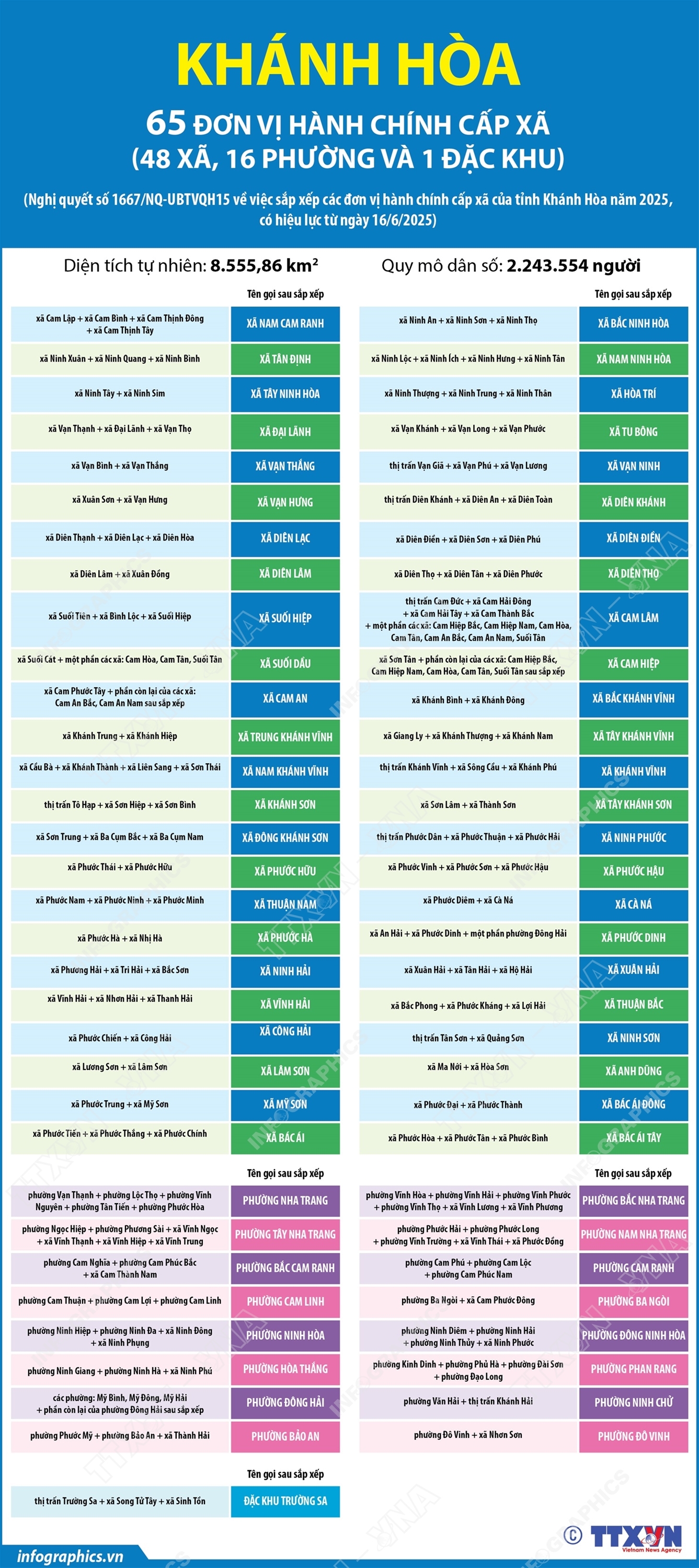 Phổ biến giáo dục Pháp luậtThông tin đồ họa Thông tin chi tiết sắp xếp các đơn vị hành chính cấp xã của tỉnh Khánh Hòa Thứ hai, 30/06/2025 13:59 Hà Nội (TTXVN 27/6) Theo Nghị quyết số 1667/NQ-UBTVQH15 ngày 16/6/2025 của Ủy ban Thường vụ Quốc hội, sau khi sắp xếp, tỉnh Khánh Hòa có 65 đơn vị hành chính cấp xã, gồm 48 xã, 16 phường và 1 đặc khu.