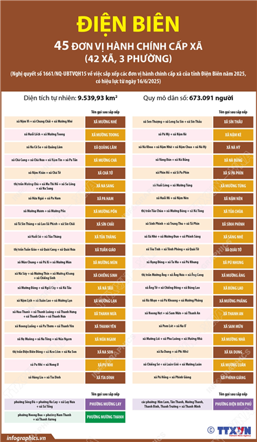 Tin cùng chuyên mục Từ năm học 2025-2026: Tất cả trẻ em, học sinh trường công lập, dân lập được miễn, hỗ trợ học phí30/06/2025 14:08Hà Nội (TTXVN 27/6) Chiều 26/6/2025, tại Kỳ họp thứ 9, Quốc hội khóa XV đã biểu quyết thông qua Nghị quyết về miễn, hỗ trợ học phí đối với trẻ em mầm non, học sinh phổ thông, người học chương trình giáo dục phổ thông trong cơ sở giáo dục thuộc hệ thống giáo dục quốc... Thông tin chi tiết sắp xếp các đơn vị hành chính cấp xã của tỉnh Bắc Ninh30/06/2025 14:07Hà Nội (TTXVN 27/6) Theo Nghị quyết số 1658/NQ-UBTVQH15 ngày 16/6/2025 của Ủy ban Thường vụ Quốc hội, sau khi sắp xếp, tỉnh Bắc Ninh có 99 đơn vị hành chính cấp xã, gồm 66 xã và 33 phường; trong đó có 65 xã, 33 phường hình thành sau sắp xếp quy... Thông tin chi tiết sắp xếp các đơn vị hành chính cấp xã của tỉnh Gia Lai30/06/2025 14:04Hà Nội (TTXVN 27/6) Theo Nghị quyết số 1664/NQ-UBTVQH15 ngày 16/6/2025 của Ủy ban Thường vụ Quốc hội, sau khi sắp xếp, tỉnh Gia Lai có 135 đơn vị hành chính cấp xã, gồm 110 xã và 25 phường; trong đó có 101 xã, 25 phường hình thành sau sắp xếp quy định... Thông tin chi tiết sắp xếp các đơn vị hành chính cấp xã của tỉnh Lai Châu30/06/2025 14:03Hà Nội (TTXVN 27/6) Theo Nghị quyết số 1670/NQ-UBTVQH15 ngày 16/6/2025 của Ủy ban Thường vụ Quốc hội, sau khi sắp xếp, tỉnh Lai Châu có 38 đơn vị hành chính cấp xã, gồm 36 xã và 2 phường. Thông tin chi tiết sắp xếp các đơn vị hành chính cấp xã của tỉnh Đồng Nai30/06/2025 14:03Hà Nội (TTXVN 27/6) Theo Nghị quyết số 1662/NQ-UBTVQH15 ngày 16/6/2025 của Ủy ban Thường vụ Quốc hội, sau khi sắp xếp, tỉnh Đồng Nai có 95 đơn vị hành chính cấp xã, gồm 72 xã và 23 phường; trong đó có 67 xã, 21 phường hình thành sau sắp xếp quy... Thông tin chi tiết sắp xếp các đơn vị hành chính cấp xã của tỉnh Điện Biên30/06/2025 14:01Hà Nội (TTXVN 27/6) Theo Nghị quyết số 1661/NQ-UBTVQH15 ngày 16/6/2025 của Ủy ban Thường vụ Quốc hội, sau khi sắp xếp, tỉnh Điện Biên có 45 đơn vị hành chính cấp xã, gồm 42 xã và 03 phường.