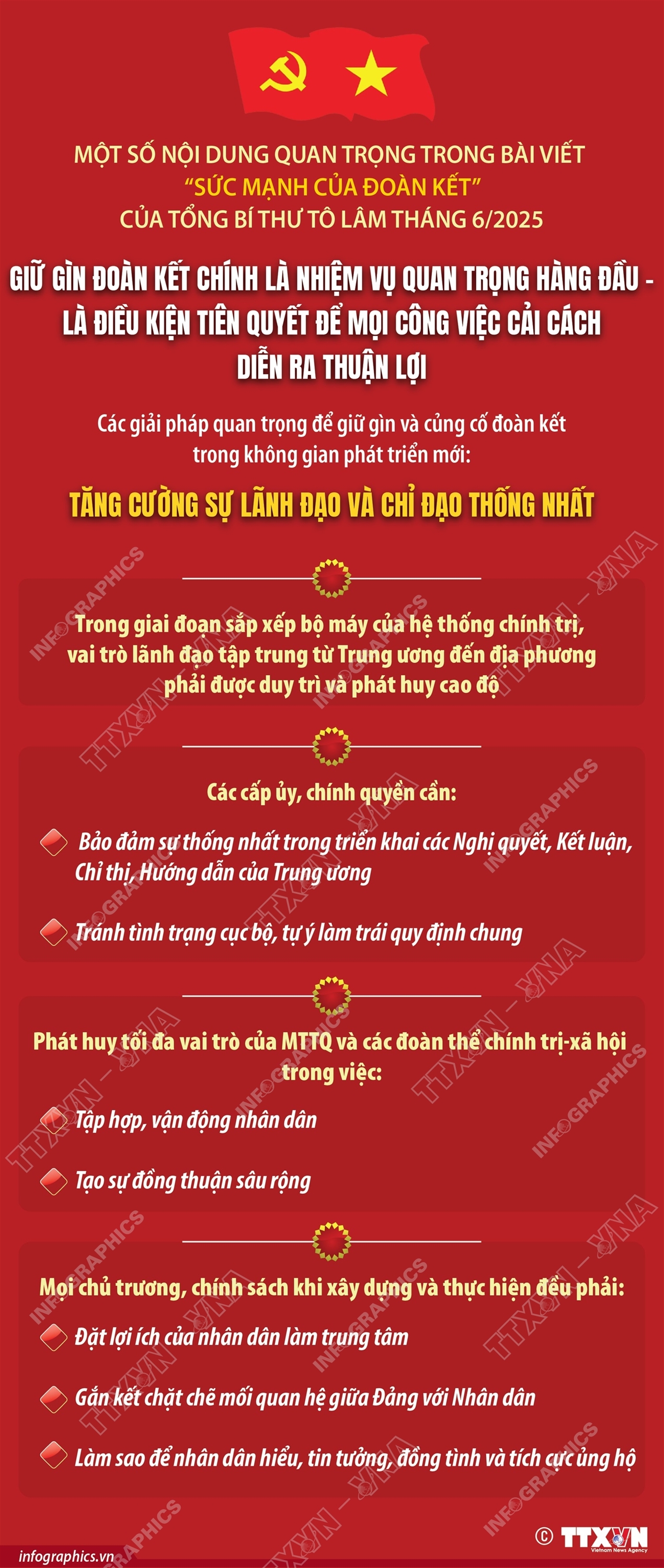 Phổ biến giáo dục Pháp luậtThông tin đồ họa Tăng cường sự lãnh đạo và chỉ đạo thống nhất Thứ hai, 30/06/2025 09:53 Hà Nội (TTXVN 29/6) Trong bài viết “Sức mạnh của đoàn kết” viết tháng 6/2025, Tổng Bí thư Tô Lâm nhấn mạnh, để giữ gìn và củng cố đoàn kết trong không gian phát triển mới, cần triển khai đồng bộ một số giải pháp quan trọng. Một trong những giải pháp đó là tăng cường sự lãnh đạo và chỉ đạo thống nhất. Trong giai đoạn sắp xếp bộ máy của hệ thống chính trị, vai trò lãnh đạo tập trung từ Trung ương đến địa phương phải được duy trì và phát huy cao độ. Các cấp ủy, chính quyền cần bảo đảm sự thống nhất trong triển khai các Nghị quyết, Kết luận, Chỉ thị, Hướng dẫn của Trung ương, tránh tình trạng cục bộ, tự ý làm trái quy định chung. Đồng thời, cần phát huy tối đa vai trò của Mặt trận Tổ quốc và các đoàn thể chính trị - xã hội trong việc tập hợp, vận động nhân dân, tạo sự đồng thuận sâu rộng. Mọi chủ trương, chính sách khi xây dựng và thực hiện đều phải đặt lợi ích của nhân dân làm trung tâm, gắn kết chặt chẽ mối quan hệ giữa Đảng với Nhân dân, làm sao để nhân dân hiểu, tin tưởng, đồng tình và tích cực ủng hộ.