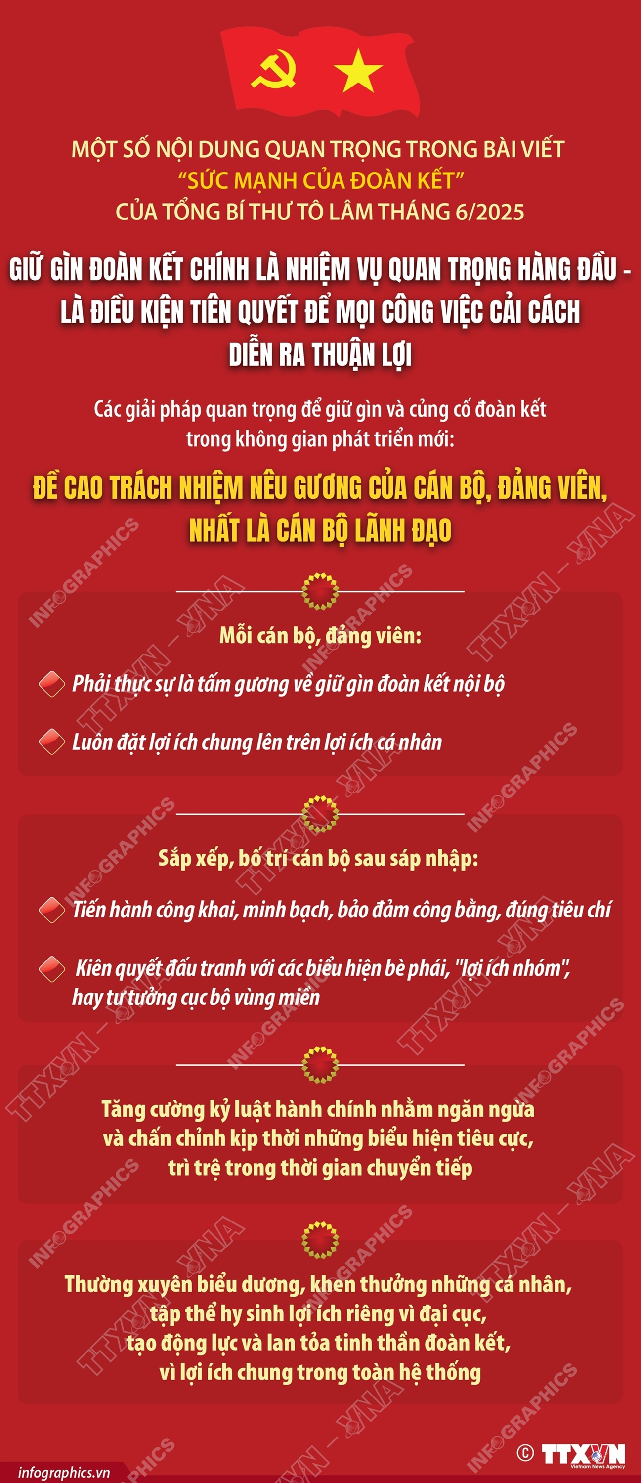 Phổ biến giáo dục Pháp luậtThông tin đồ họa Đề cao trách nhiệm nêu gương của cán bộ, đảng viên, nhất là cán bộ lãnh đạo Thứ hai, 30/06/2025 09:55 Hà Nội (TTXVN 29/6) Trong bài viết “Sức mạnh của đoàn kết” viết tháng 6/2025, Tổng Bí thư Tô Lâm nhấn mạnh, để giữ gìn và củng cố đoàn kết trong không gian phát triển mới, cần triển khai đồng bộ một số giải pháp quan trọng. Một trong những giải pháp đó là đề cao trách nhiệm nêu gương của cán bộ, đảng viên, nhất là cán bộ lãnh đạo. Mỗi cán bộ, đảng viên phải thực sự là tấm gương về giữ gìn đoàn kết nội bộ, luôn đặt lợi ích chung lên trên lợi ích cá nhân. Việc sắp xếp, bố trí cán bộ sau sáp nhập phải được tiến hành một cách công khai, minh bạch, bảo đảm công bằng, đúng tiêu chí, kiên quyết đấu tranh với các biểu hiện bè phái, "lợi ích nhóm", hay tư tưởng cục bộ vùng miền. Song song với đó, kỷ luật hành chính cần được tăng cường mạnh mẽ nhằm ngăn ngừa và chấn chỉnh kịp thời những biểu hiện tiêu cực, trì trệ trong thời gian chuyển tiếp. Đặc biệt, phải thường xuyên biểu dương, khen thưởng những cá nhân, tập thể hy sinh lợi ích riêng vì đại cục, tạo động lực và lan tỏa tinh thần đoàn kết, vì lợi ích chung trong toàn hệ thống.